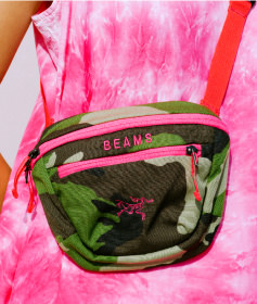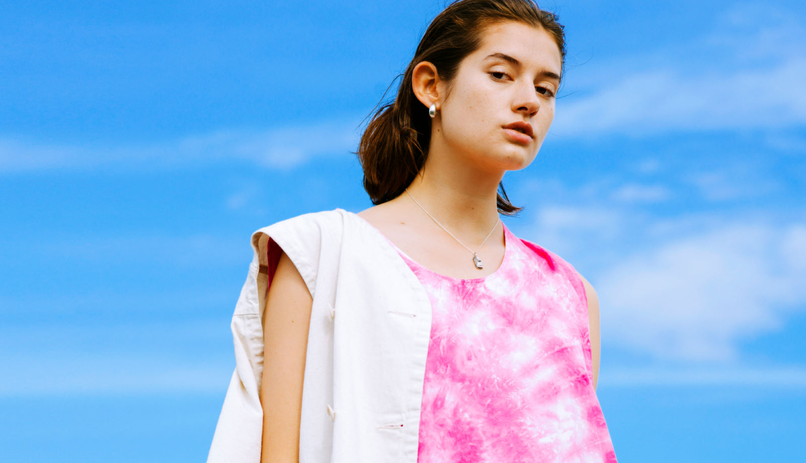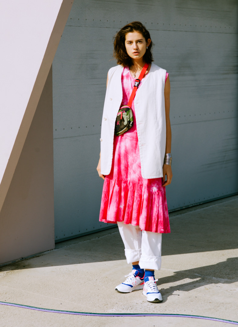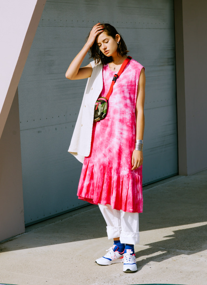 この夏に、挑戦してみたいパターンのひとつがタイダイ柄。シーズンのトレンドに急浮上しているし、なによりそのアブストラクトな紋様が、ワードローブのアクセントになってくれる。注目は<NEEDLES(ニードルズ)>とのコラボレーションで展開するコレクション。Tシャツやスカートもありますが、ワンピースも。裾にプリーツを入れたティアードタイプで、シルエットはリラックスしているけれど、ウエストに付いた紐ベルトで変化させることもできる。素材はコットンとレーヨンをミックスしており、スムースかつ優しい着心地。カラーリングはワントーンでまとめられていてクリーンな印象も。つまり、タイダイのビギナーにも優しい、アイデアが充実している。ホワイトのデニムやスニーカーと揃えれば、派手というよりもむしろ洗練されたムード。迷彩のコンパクトバッグは、<ARC’TERYX(アークテリクス)>の人気モデルを別注したもの。