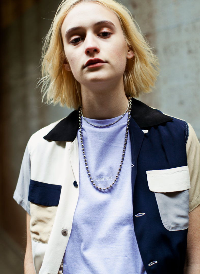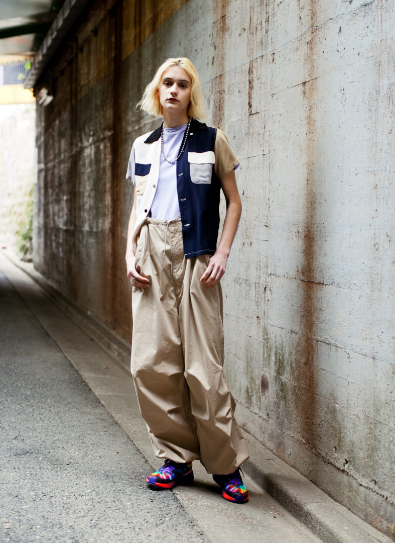 まるでフィフティーズなオープンカラーの襟の形や切り替え、レーヨン生地の風合い。こちらのシャツは、1950年代を中心としたアメリカを象徴するアイテムの、緻密なヴィンテージの再現で知られる<STYLE EYES(スタイルアイズ)>とのコラボレーションによるもの。今回は左右の身頃やポケットなどをパーツごとに切り替えた、クレイジーパターンの仕様。もともとは1940年代に流行したレーヨンスポーツシャツのハギレを再利用するために始まったものですが、50年代に入ると刺激的な服としてさらに人気が高まったのだとか。こちらのヴィンテージさながらのシャツを、モダンにコーディネート。ワイドなシルエットのオーバーパンツや、インナーのパステルカラーの差し色などがポイントになっている。タイダイ柄の<SALOMON(サロモン)>のスニーカーも欠かせない。