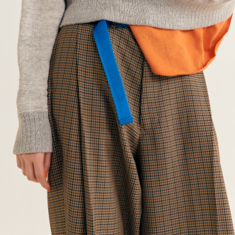 ウエストから裾にかけてたっぷり取ったタック。ハウンドトゥースの柄も相まって野暮ったいおじさんパンツさを演出。