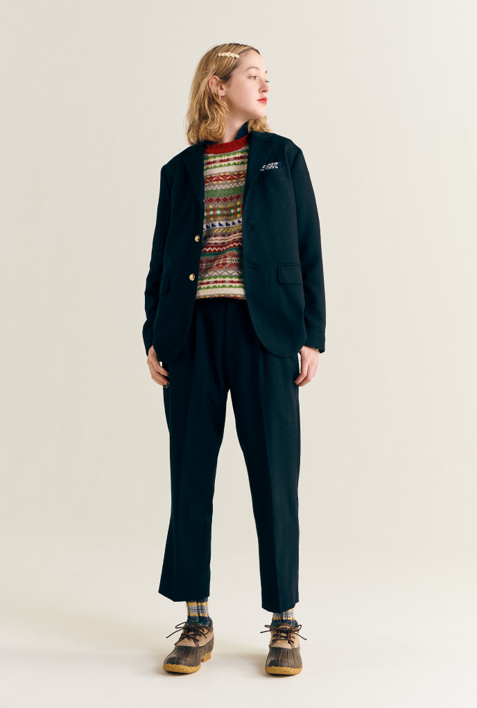 ネイビーブレザーとアイビーパンツのセットアップは、私たちの正装。B.D.シャツを合わせた王道スタイルももちろんいいですが、たまにはフェアアイルベストやビーンブーツでカントリーをミックス。くれぐれも東海岸のムードを忘れずに。