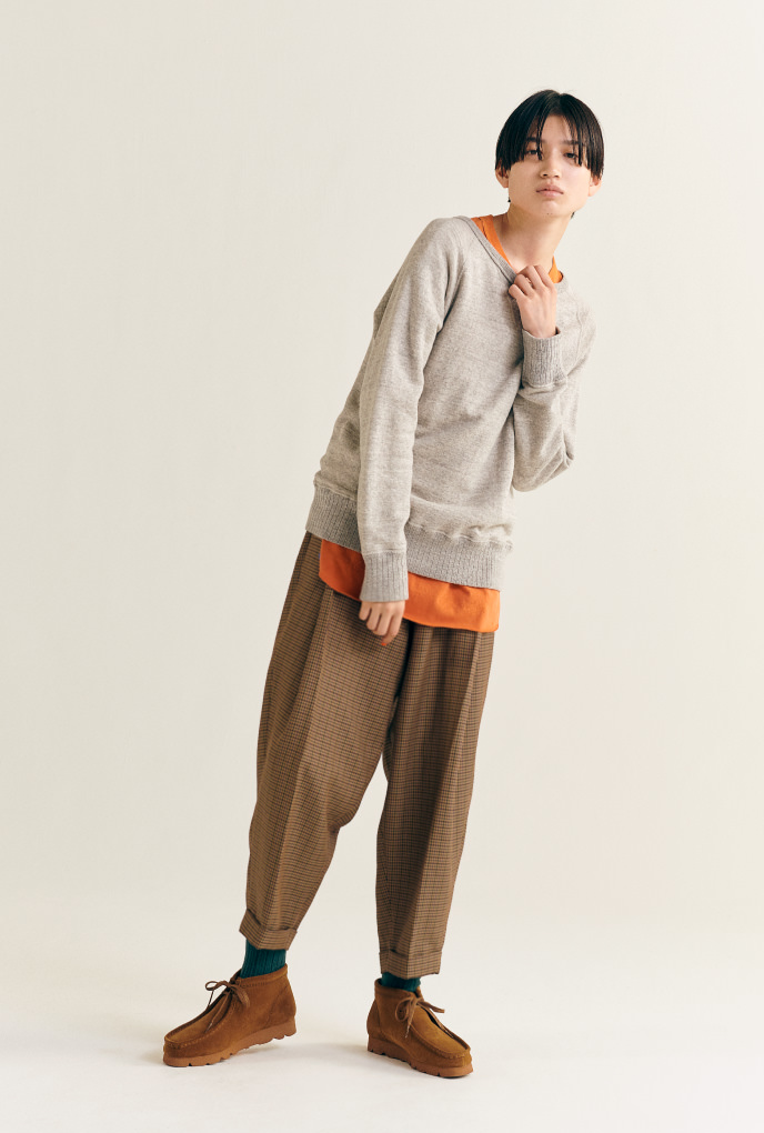 アメリカ英語の“ゆるい”、“たるんだ”を意味するスラックス(諸説あり)。アイビーパンツとは別腹で野暮ったいスラックスも大好物な私たちは、杢グレーのスウェットと〈クラークス〉の『ワラビー』を合わせて理想的なおじさん風の着こなしに。