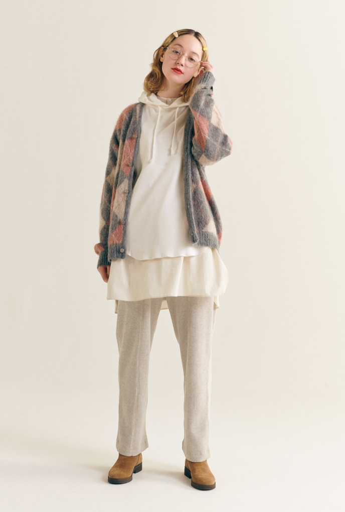 今年はおうち時間が増えた分、リラックスウェアに気を配ることもしばしば。サーマルフーディはスウェット感覚で着られる優れもので、インナーにシャツドレスを、仕上げにカーディガンを羽織れば、BOYらしいワンマイルウェアが完成します。
