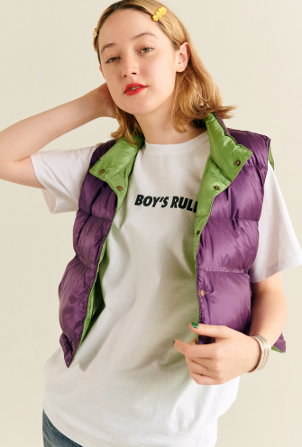 元ネタは1970年代のクラシカルなヴィンテージのダウンベストです。私たちがとくにこだわったのはサイズ感。大好きなダウンベストをできるだけ長い季節楽しめるようにコンパクトなサイズにしました。秋はアウターとして、寒くなったらインナーダウンとしても活躍してくれます。冬はとにかく着膨れたい私たちは、レイヤードを意識的にして、とことん着膨れを楽しみます。