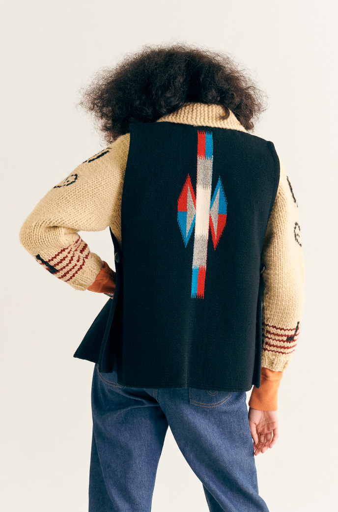 〈ビームス ボーイ〉的一張羅チマヨ織りの歴史はおおよそ17世紀後半に始まりました。現在のメキシコからニューメキシコ州チマヨ村へやってきた初代オルテガから代々受け継がれてきたそのはた織り技術は、いまだに昔ながらの製法で家内工業的に生産されています。チマヨ織りの最高峰の〈オルテガ〉ですが、最近では若者が街へ出て仕事をするようになり、後継者が少なくなっているのが現状。頭の中で柄を描きながら左右対称に織っていく職人技、つまりデザイン図案などなしに織る技術と伝統が、これからも長く受け継がれていくことを願うばかりです。かつて先輩が格好良く着こなしていたチマヨベストは、永遠に私たちの一張羅です。
