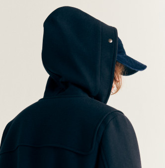 重厚感のあるコートが大好物な私たちですが、〈ビームス ボーイ〉のダッフルコートでは実用性を考慮し、デイリーに着こなせる軽すぎないメルトンを使用しています。フロントのトグルは、女性がバランスよく着用できるように着丈の長さに対し、位置を高めに設定。大きめなフードにはスナップボタンがついていて、フィット感を調整することで防寒性を高めることができます。