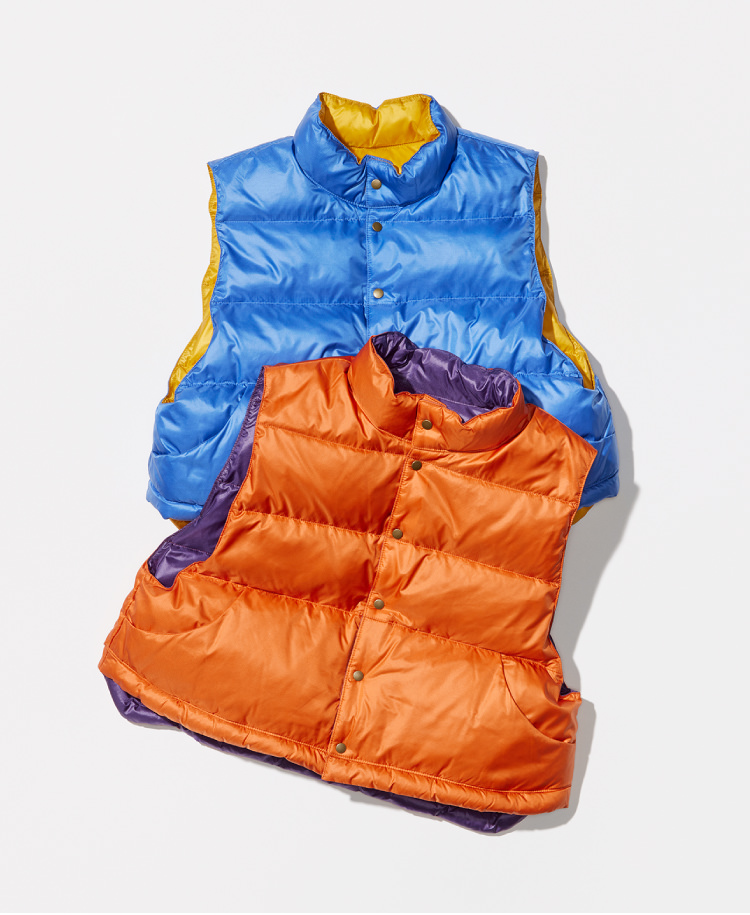We say with confidence that a layered down vest look gives off a hero presence. Our down vest is inspired by classic models made in the 1980s, the time period in which the movie was set. Actually, we have offered this popular item regularly since our fall/winter 2020 collection, albeit with several updates. For this season’s collection, the collar has been rounded, while the silhouette looks bulkier thanks to the down-filled corners. The armholes are bigger to make it easier to layer over outerwear. The fabric has also been switched from nylon taffeta to ripstop nylon. The reversible design vest features retro sporty shade colors reminiscent of classical outdoor styles. Enjoy sporting a premium bundled-up look in this winter with this down vest.