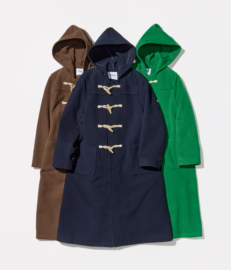 Our duffle coat shown here has been a regular part of our lineup since the fall/winter 2019 collection, waiting for a chance to travel to the U.S. with us. It comes in three color options this year: navy, brown and green. The design is mostly the same as last year’s, featuring a big storm patch to keep out the rain, four small wooden toggles placed higher, patch pockets instead of flap pockets, and a large hood with press-studs. We switched the fabric to anti-pilling material and adjusted the measurements slightly according to the new fabric’s thickness. Did you know that duffle coats were originally for the military? Read BOY’S RULE Nº2 again. The coat used to be dispensed to the British Royal Navy and was initially worn by fishermen in Belgium. Beatniks who gathered around Columbia University in the 1940s also loved to wear duffle coats. We do admire this coat because its history is as thick as the fabric.