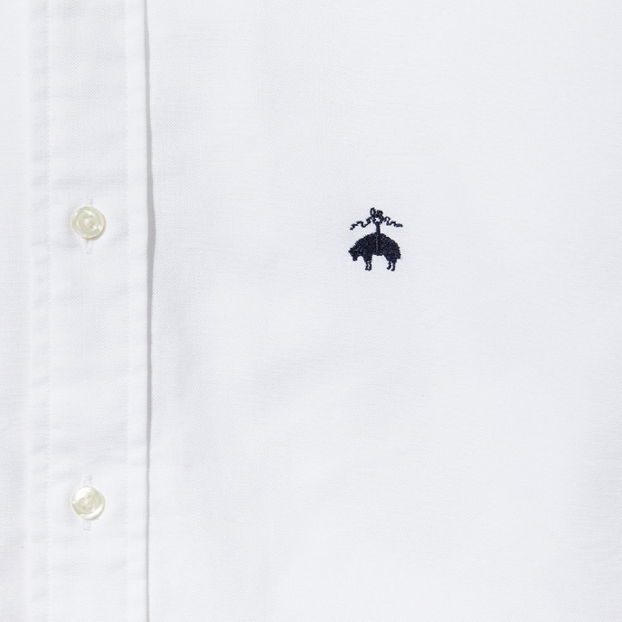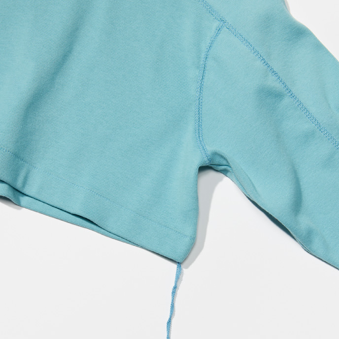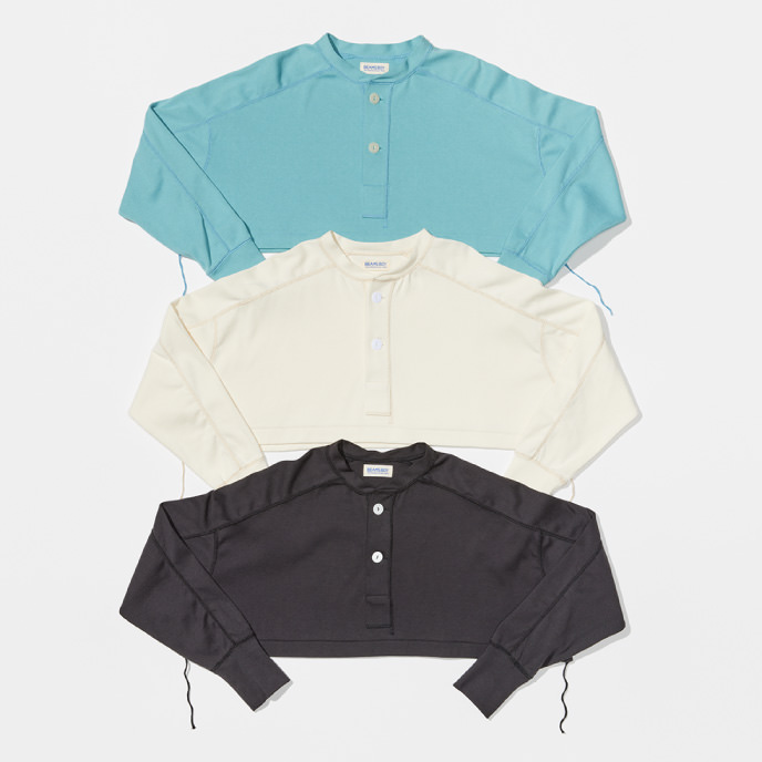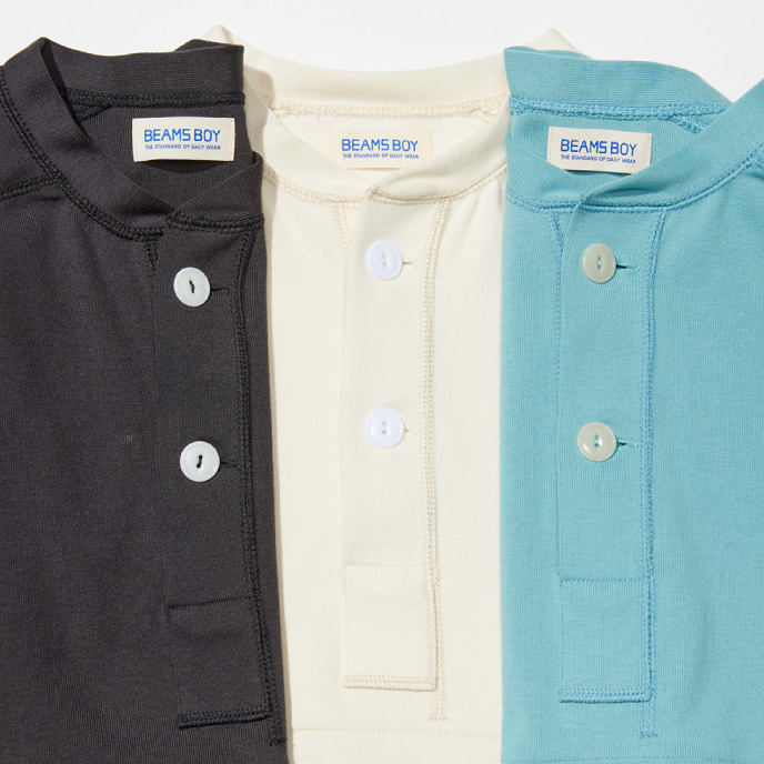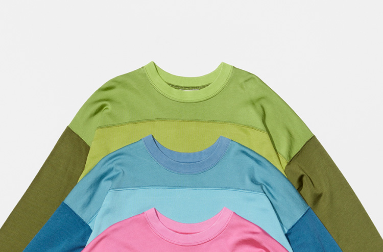 ロゴの位置は、オーバーオールやブレザーを着たときにチラリと覗くように計算したもの。ロゴの色はボディと配色に。一枚着るだけですでに差し色がある仕様になっているので、とってもお買い得。それゆえ、色の組み合わせには入念に気を配ります。配色のモチーフはさまざまですが、アメリカの大学やプロスポーツチームのカラーを参考にしたり、シーズンアイテムとの相性も検討しています。今シーズンはワークの土臭い雰囲気に合わせても爽やかに見えるように意識しました。また、ネックのタコバインダーも配色にし、見えない部分にもこだわります。それがBOYの体質なのです。
