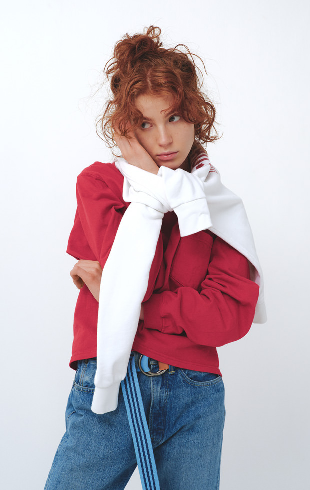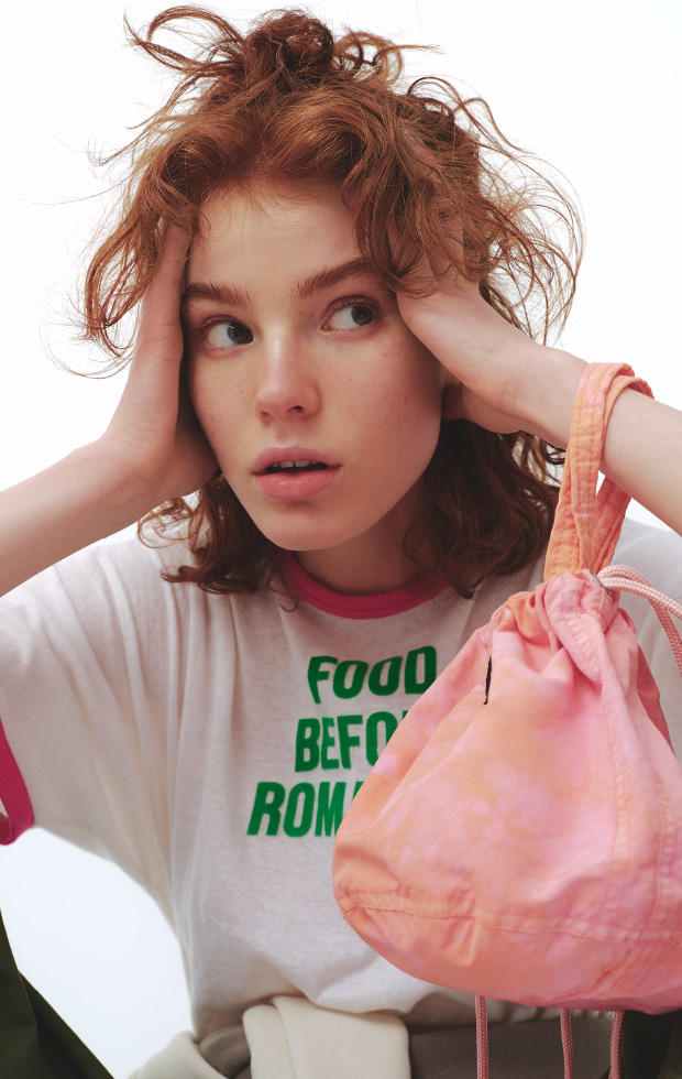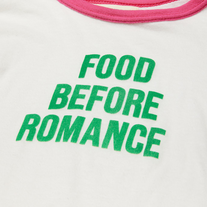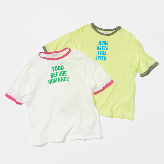 元々は運動着として作られたリンガーTシャツですが、ジョン・レノンの影響で1970年代中頃からファッションアイテムとして認知されるようになりました。あの『NEW YORK CITY』のロゴTシャツを着たジョン・レノンの写真は、あまりにも有名ですよね。80年代以降はアメカジアイテムとしても定着し、今では古着で安くていいものがたくさん見つかります。では、BOYらしいリンガーTシャツってどういうものだろう?私たちが辿り着いたのは、やはりジョン・レノンでした。とはいえ、直球で表現するのはBOYらしくありませんので、あくまで彼が着ていた当時のムードです。BOY女子を連想したメッセージ(“色気より食い気”と“急がば回れ”)を、あえて微妙なフォントを選び、位置をズラしてプリント。それもわざわざフロッキープリントにするこだわりぶり。古着にあるような薄手の粗野な生地感を使い、古着にはあまりない配色で仕上げる。いなたさをとことん狙った、こだわりの一枚です。カレッジプリントの一歩先を行くロゴTシャツをお探しの方に、ぜひ!