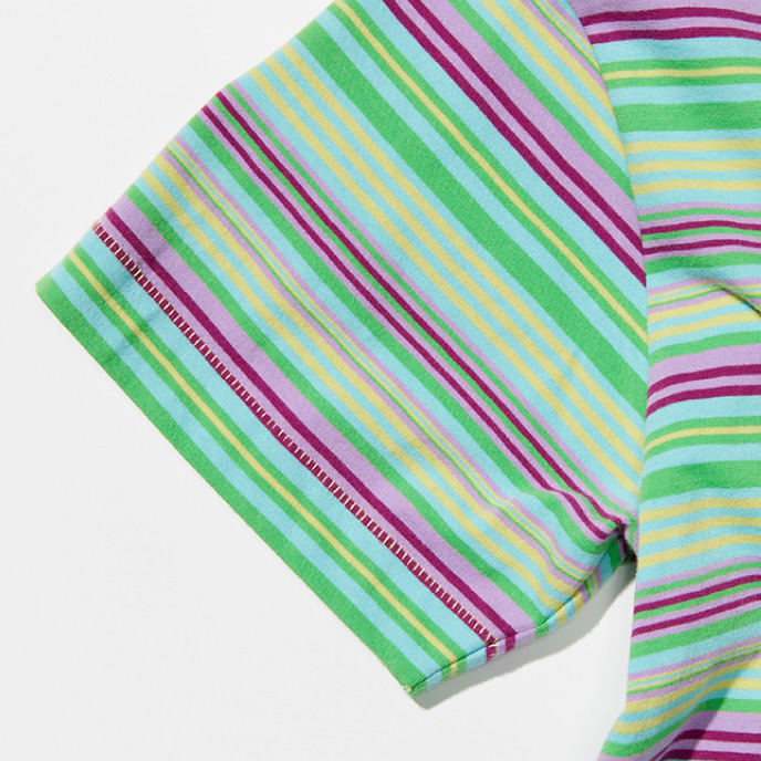 私たちが大好きな映画、『スタンド・バイ・ミー』の舞台となった1950年代のレトロな色合いをイメージしたマルチボーダーTシャツ。こちらも気づけば4年目を迎える好評アイテムに。今年はボーダーのピッチ幅を細めに変更し、古着などを参考にしながら、一から配色を考え直しました。紡績の過程で生まれる落ち綿を原料にしたラフィ糸(再生糸)を使用した生地は、ヴィンテージTシャツのようでナチュラルな風合いが特徴。首のつまり具合、ステッチの色合い、縫製方法など、年代に合わせたディテールを採用しながら、夏に一枚で着ても様になるようにこだわりました。ボーダーTシャツのことを考えているうちに、なんだかまた『スタンド・バイ・ミー』が観たくなってきちゃった。何度観ても飽きない名作映画同様、このボーダーTシャツもガシガシ着倒してもらえたら嬉しいです。