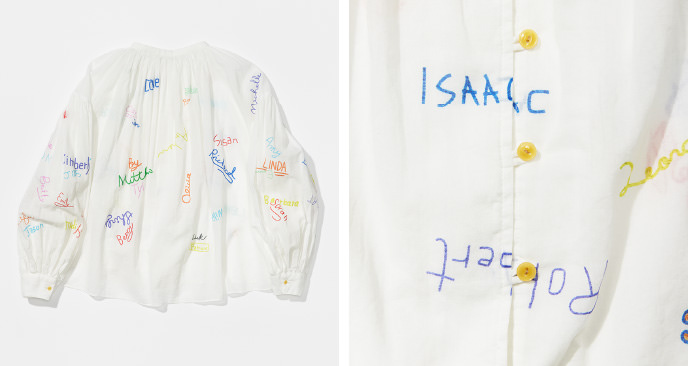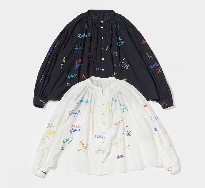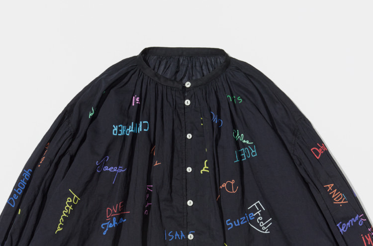アメリカのカレッジ古着に見られる寄せ書きや、寄せ書き風の刺繍が施されたアイテム。持ち主はどんな人で、当時はどんな風に過ごしていたのだろうと、あれこれストーリーを勝手に妄想してしまいます。そして、それをわざわざ形にしてしまったのが、このギャザースモックです。以下、フィクション。ときは1950年代、私はアメリカの高校に通う卒業間近の学生。もうすぐ離れ離れになってしまう大好きなクラスメイトたちのことを絶対に忘れたくないから名前を書いてもらおう。でももし名前が消えてしまったら、大切な思い出まで消えてしまうようで悲しい。そうだ、みんなの名前にチェーンステッチをかけよう!私って天才なのかも……。という友だち思いの女子が着ていたであろう洋服を表現しました。ちょっと重めに感じてしまうかもしれませんが、ご了承ください。夏にも爽やかに着られるように刺繍はプリントにアレンジ。生地は超長綿で紡績した糸を使用したローンを甘い密度で織り上げているため、通気性がよく、真夏にも着られる長袖アイテムです。