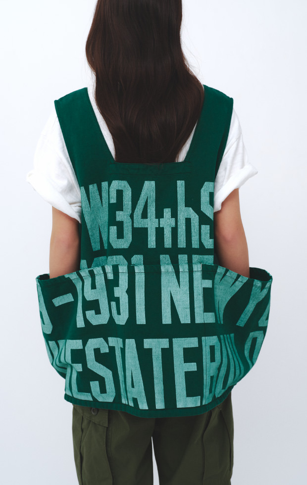 ワークをシーズンテーマにしようと考え始めた序盤の段階から、すでに作ると決めていたエプロンベスト。その昔、アメリカの新聞配達員が使っていたニュースペーパーバッグのフォントを元に、大胆にプリントをあしらいました。プリントは実際にあったアメリカの歴史的な出来事である、エンパイアステートビルが完成したニュースを採用しています。超アナログですが、紙に出力した文字を切り貼りして入念に位置をチェック。ラフなプリントを演出するため、ポケット口部分からはみ出るようにプリントをのせているのもこだわりです。ベストのデザインは古着にはないBOYのオリジナルで、前後両面で着用できる仕様に。大きなポケットを全体に配置した豊富な収納力は、まるで古着のニュースペーパーバッグを洋服化して着ているかのよう。手ぶらで出歩けることを好む私たちらしい一着です。色展開とプリントの文言は異なりますが、同じシリーズでジャケットとスカートもあります。