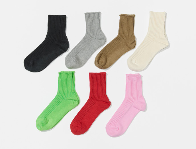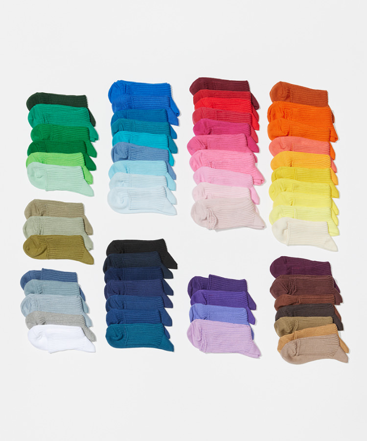 そこで今後のソックス選びの選択肢のひとつに、ぜひとも加えていただきたいのが、〈ビームス ボーイ〉定番のリブソックスです。 2013年秋冬の販売スタート以来、シーズン毎に色を変えながら作り続け、累計販売数6万足にも迫るロングセラーアイテム!左ページの写真はこれまで作ってきた過去のもので、下の写真はこの春夏のカラーバリエーションです。形の変更がないので、色を取り入れる練習にピッタリですし、1シーズンに1~2足ずつ買い足すくらいラフな気持ちで取り掛かれます。