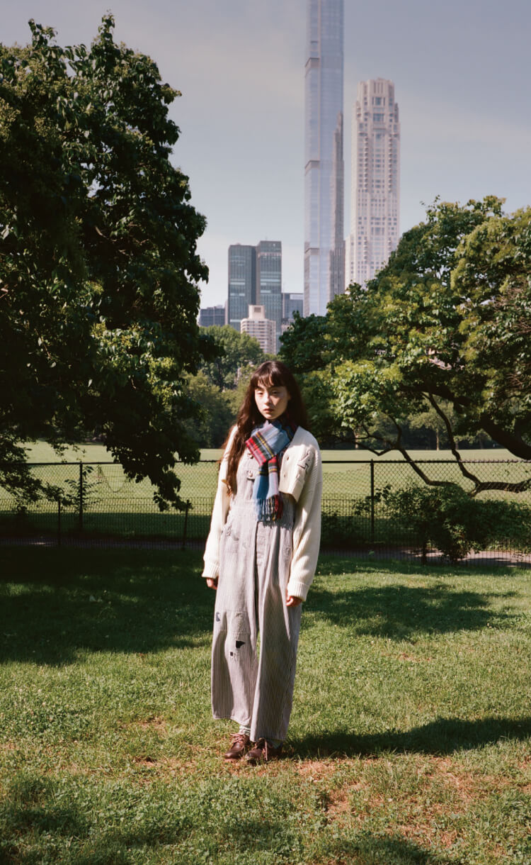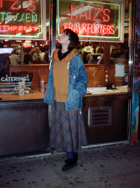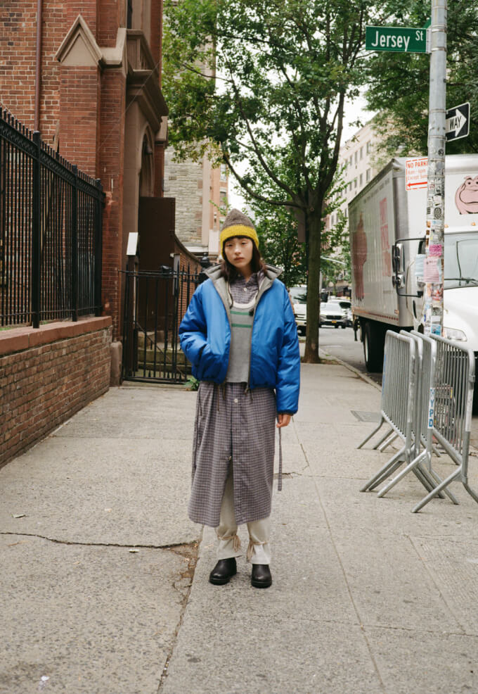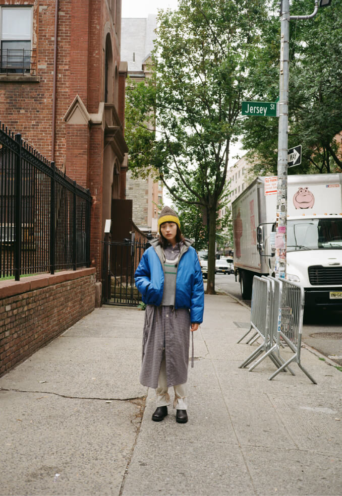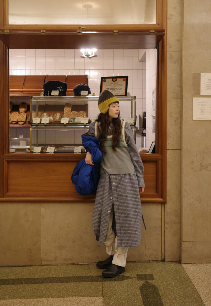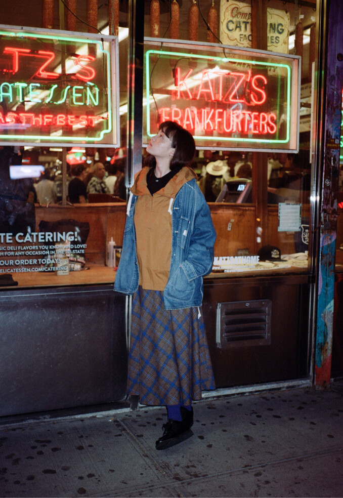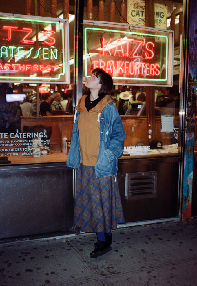 夜の散歩は、名物のパストラミサンドを求めて老舗デリへ。カバーオールを羽織っていると、なんだか仕事帰りの地元民のような気分が味わえます。アノラックやニットポロ、チェックのロングスカートという、バラバラなルーツの組み合わせでも〈BEAMS BOY〉らしくこなせる好例です。