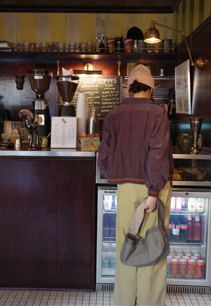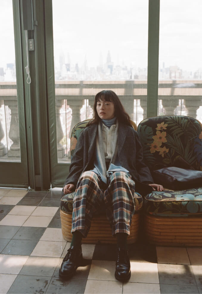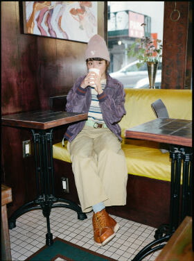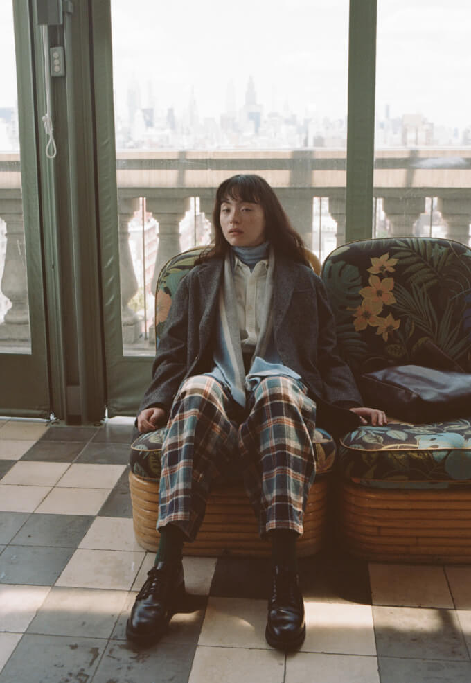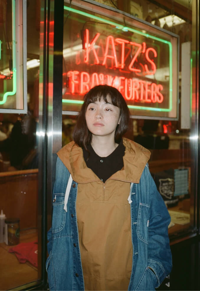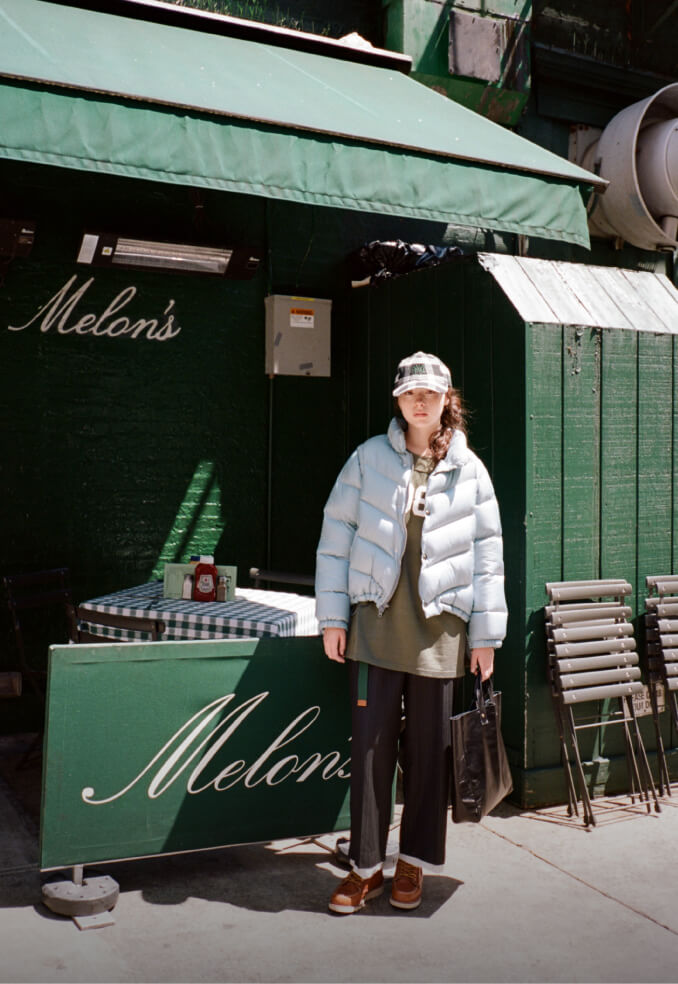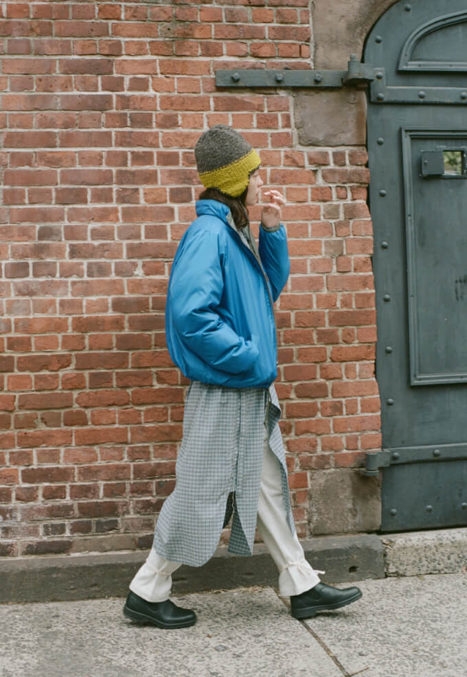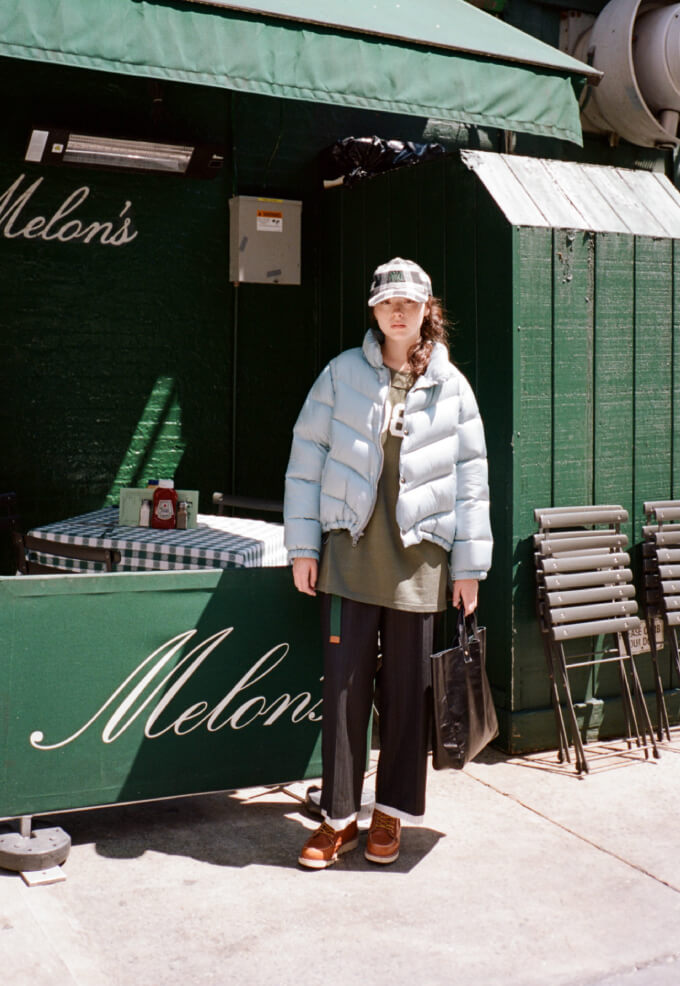 夜の散歩は、名物のパストラミサンドを求めて老舗デリへ。カバーオールを羽織っていると、なんだか仕事帰りの地元民のような気分が味わえます。アノラックやニットポロ、チェックのロングスカートという、バラバラなルーツの組み合わせでも〈BEAMS BOY〉らしくこなせる好例です。