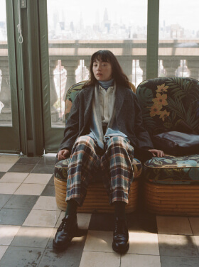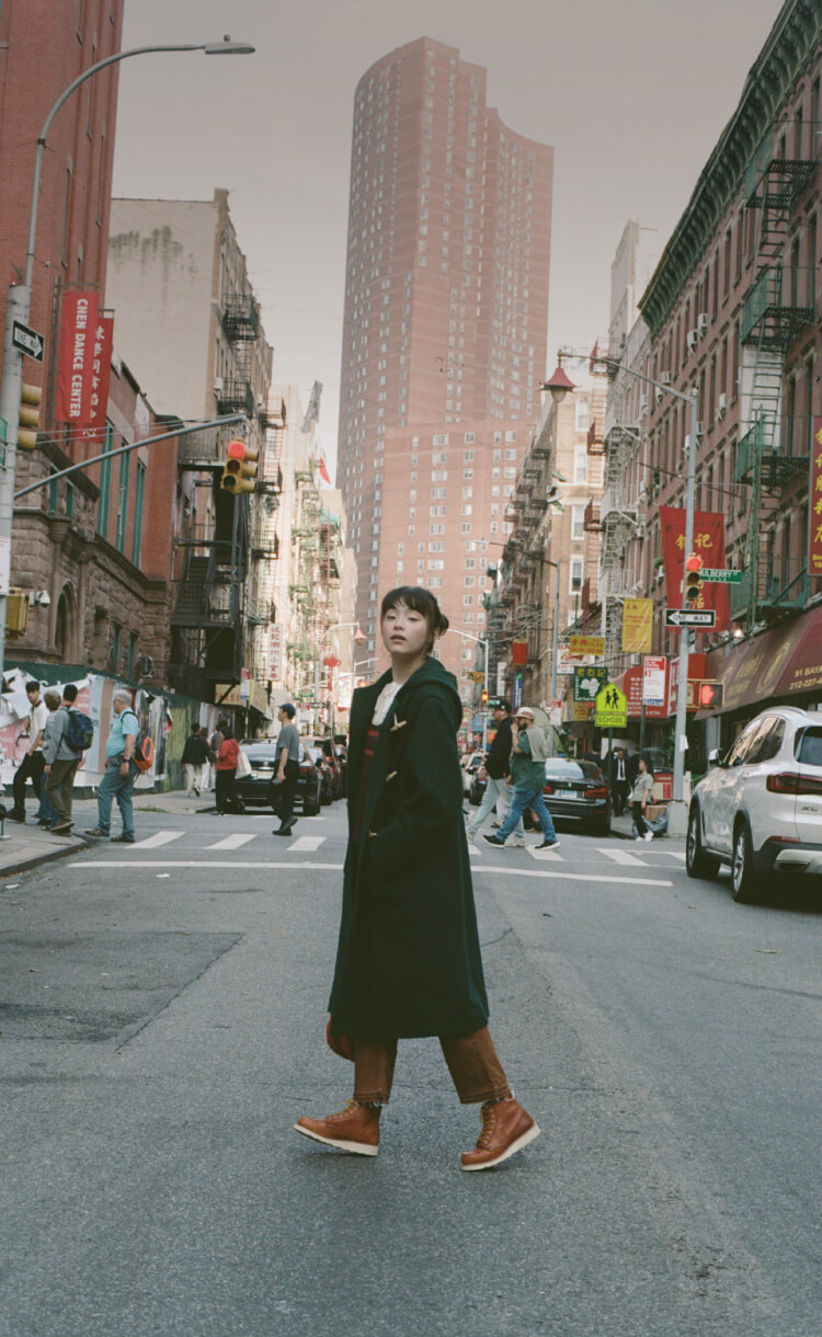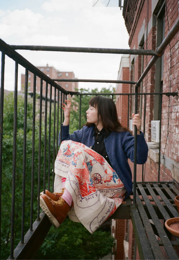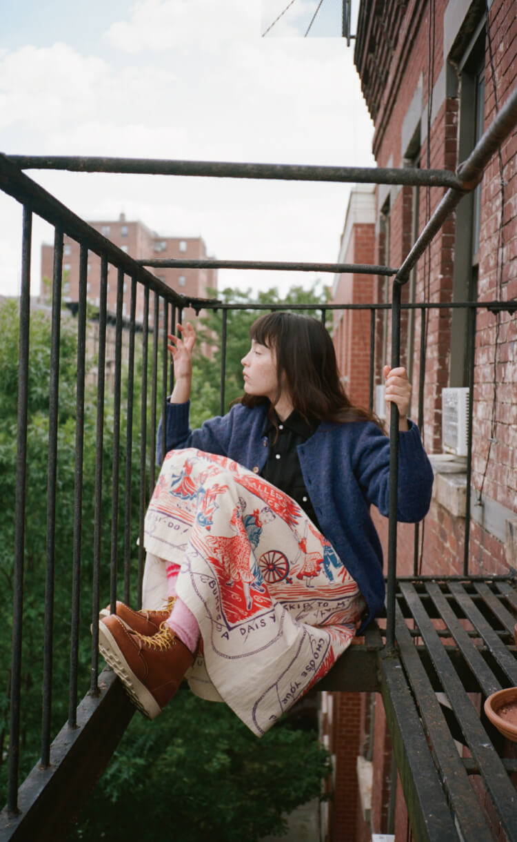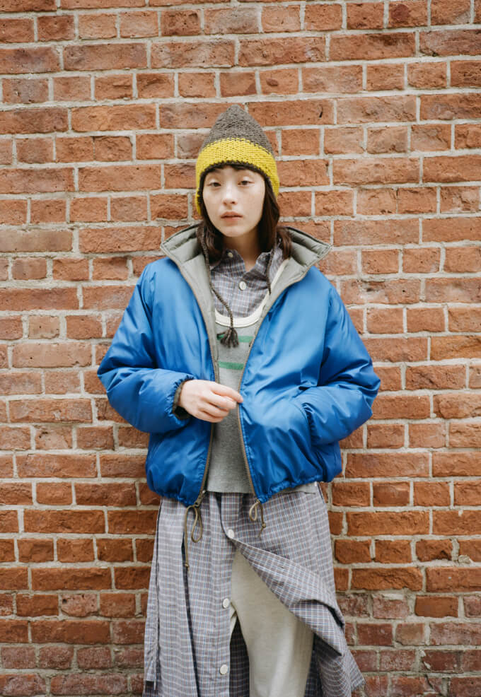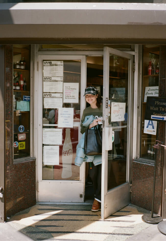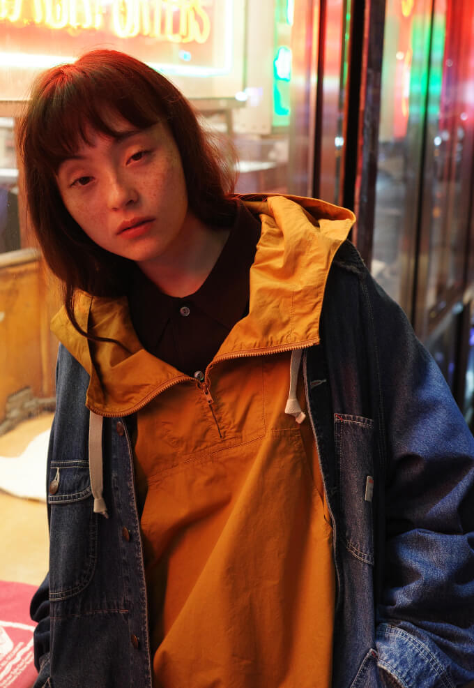 夜の散歩は、名物のパストラミサンドを求めて老舗デリへ。カバーオールを羽織っていると、なんだか仕事帰りの地元民のような気分が味わえます。アノラックやニットポロ、チェックのロングスカートという、バラバラなルーツの組み合わせでも〈BEAMS BOY〉らしくこなせる好例です。