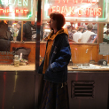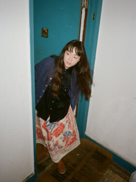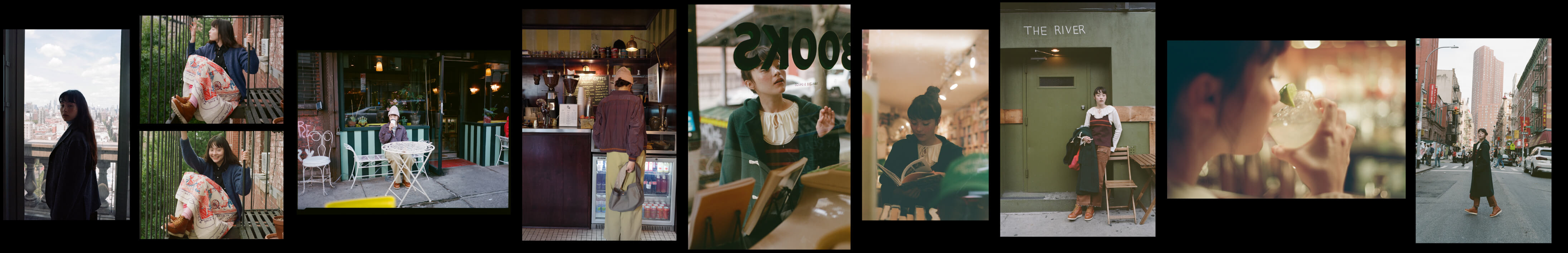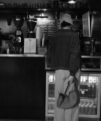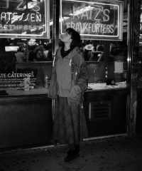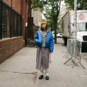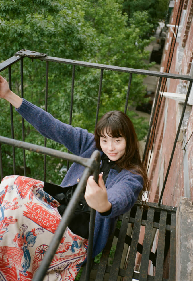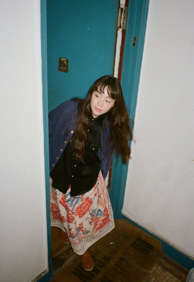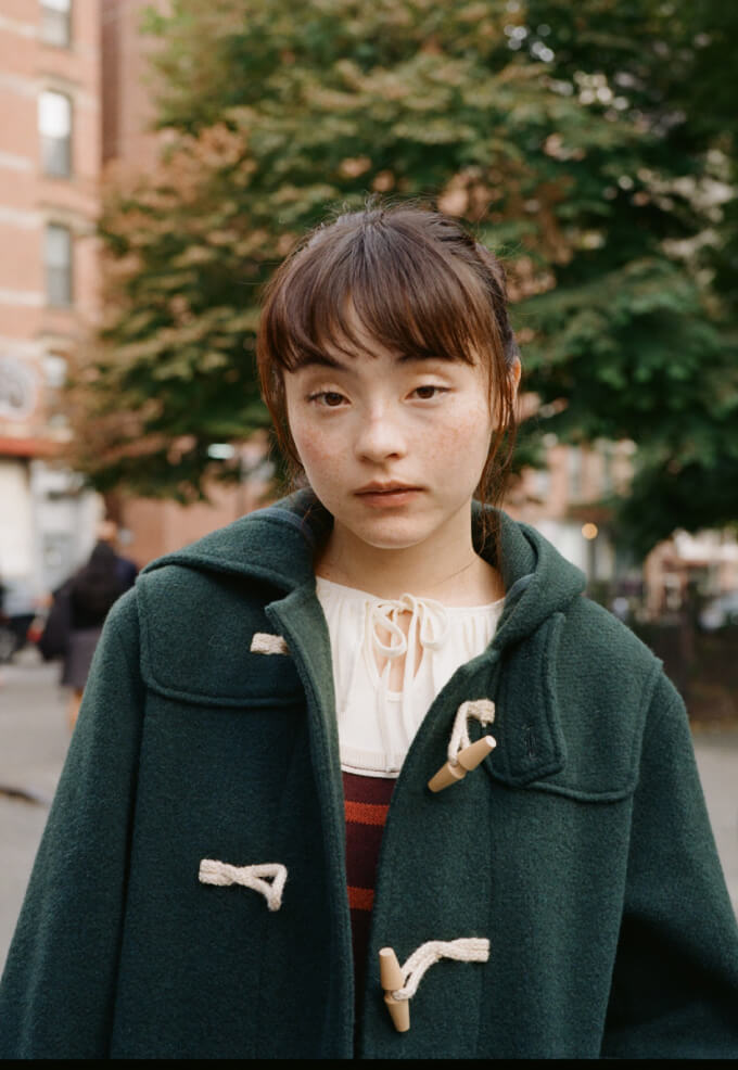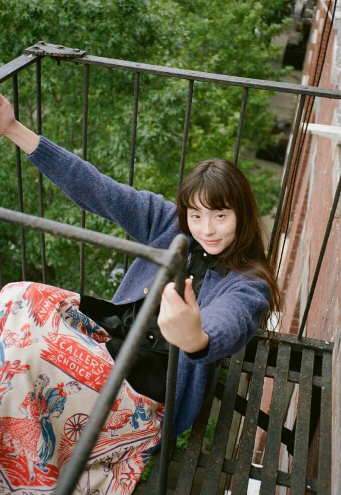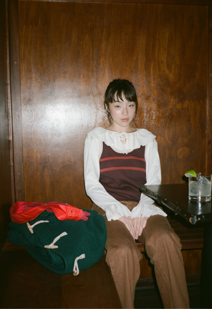 夜の散歩は、名物のパストラミサンドを求めて老舗デリへ。カバーオールを羽織っていると、なんだか仕事帰りの地元民のような気分が味わえます。アノラックやニットポロ、チェックのロングスカートという、バラバラなルーツの組み合わせでも〈BEAMS BOY〉らしくこなせる好例です。