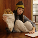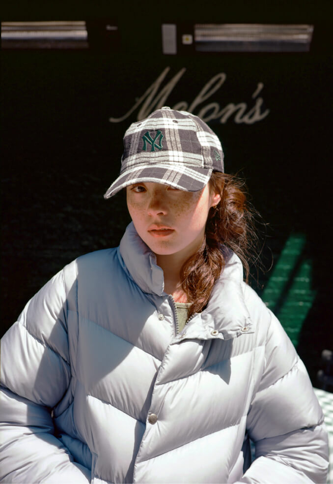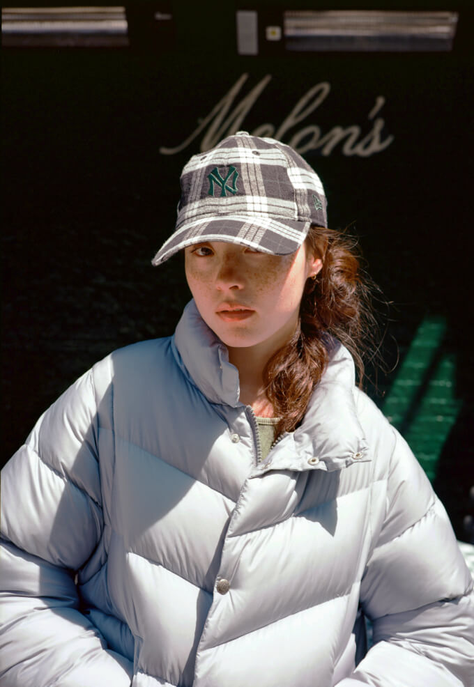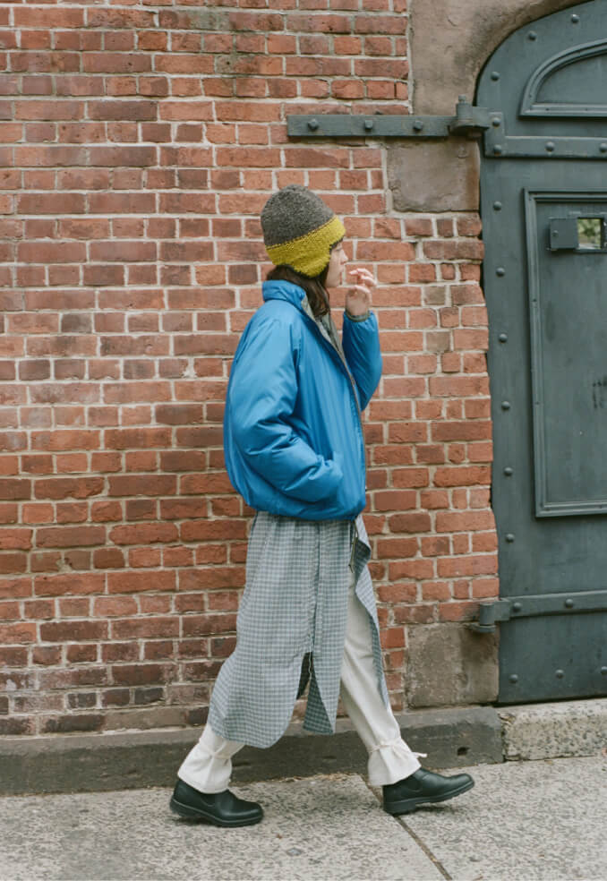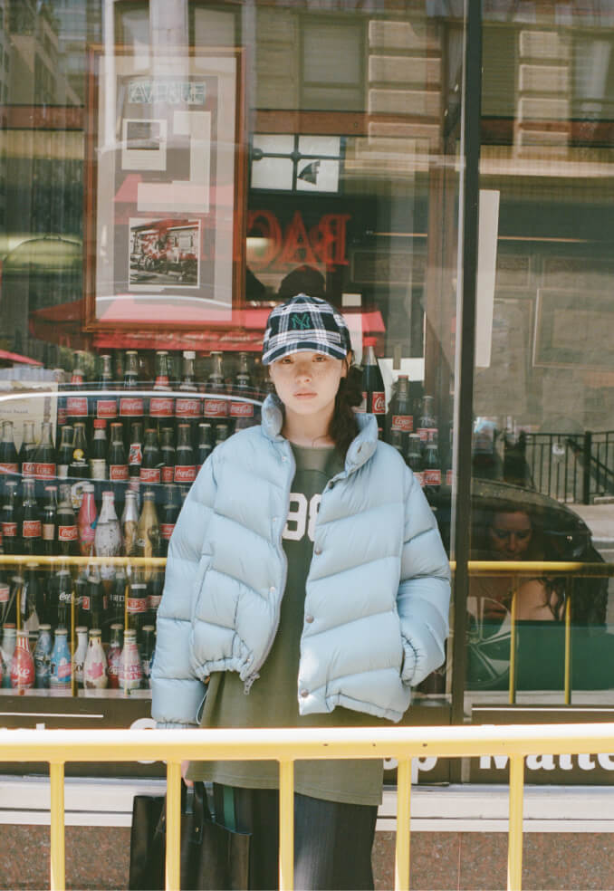 朝の散歩は、リラックスムードのアメカジスタイル。ボリュームのあるダウンジャケット、中にはチェックシャツ風のワンピース、ボトムスはスウェットパンツをチョイス。ニューヨークの街の景色が楽しくて、どこまでも歩けちゃいそう。よーし、美味しい朝ご飯を探すぞ!