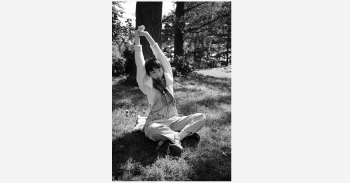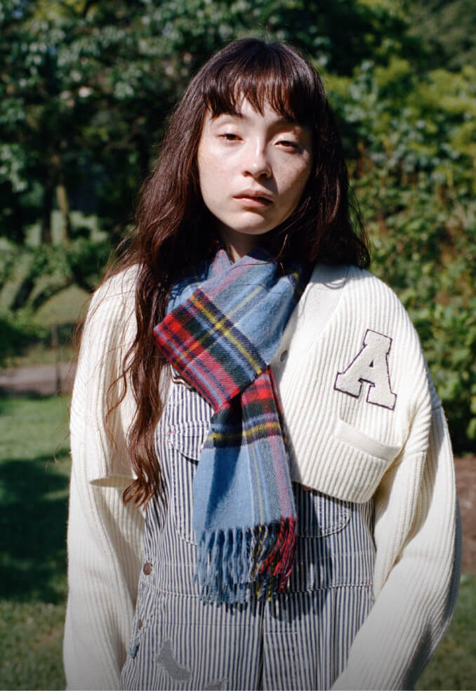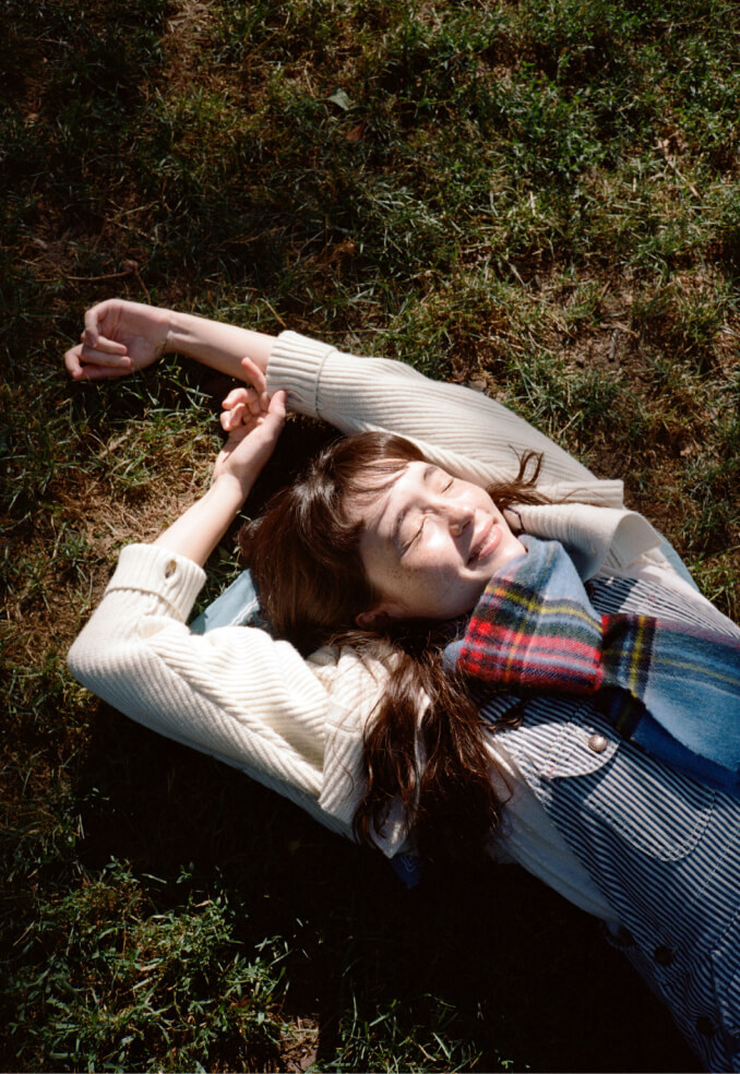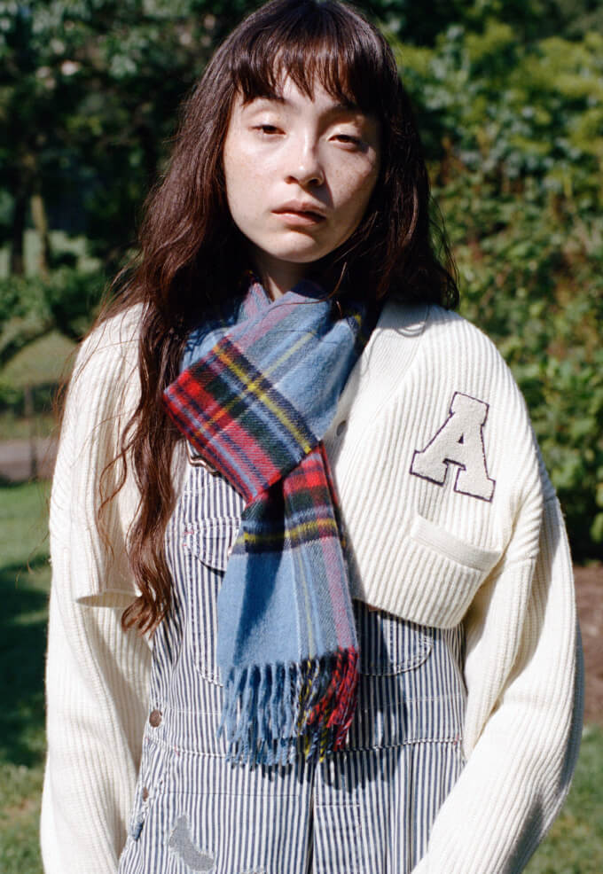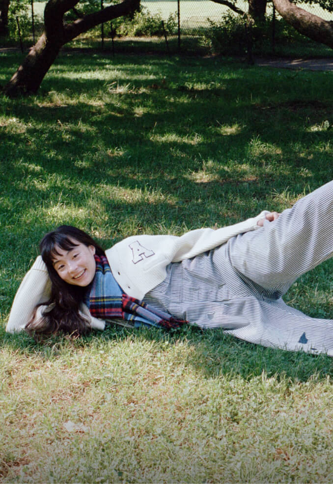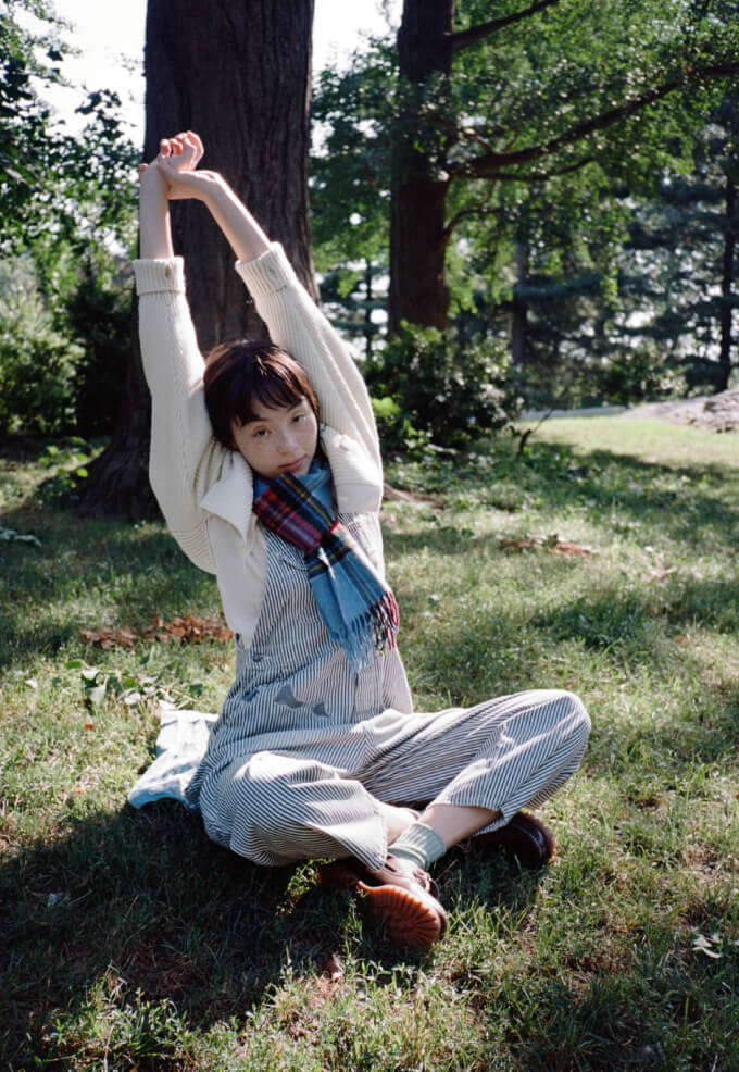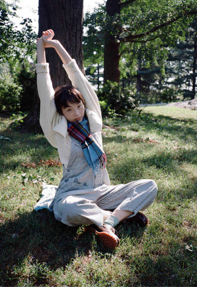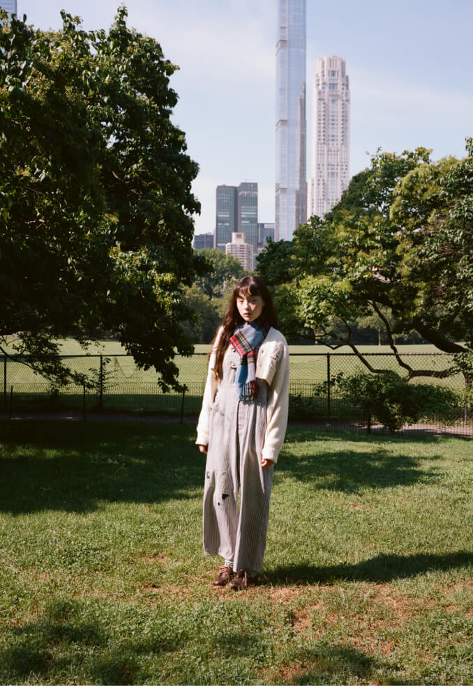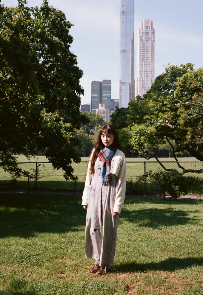 いい天気の日のセントラルパークは最高! 芝生にバンダナを敷いて座ってみたものの、やっぱり寝っ転がりたい、ということを想定して着たオーバーオールは大正解! カレッジニットのカーディガンでトラッド感も忘れずに。胸のワッペンは『アニー・ホール』の“A”です。