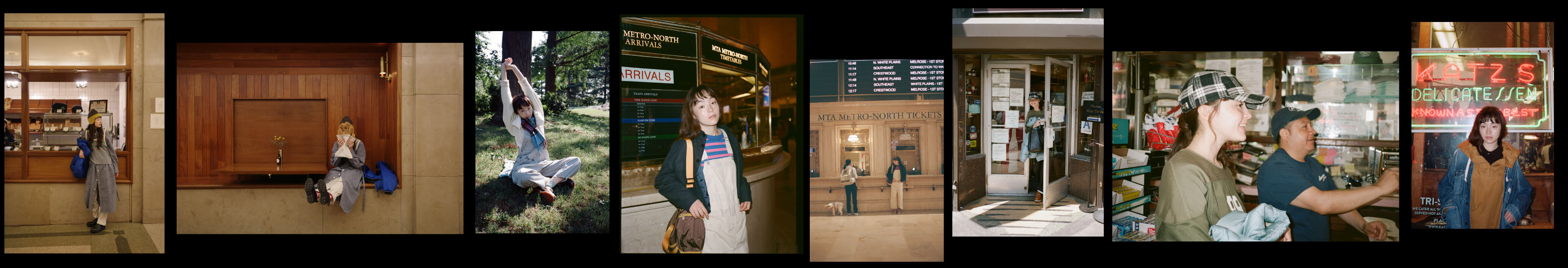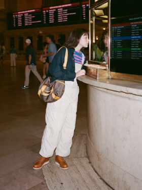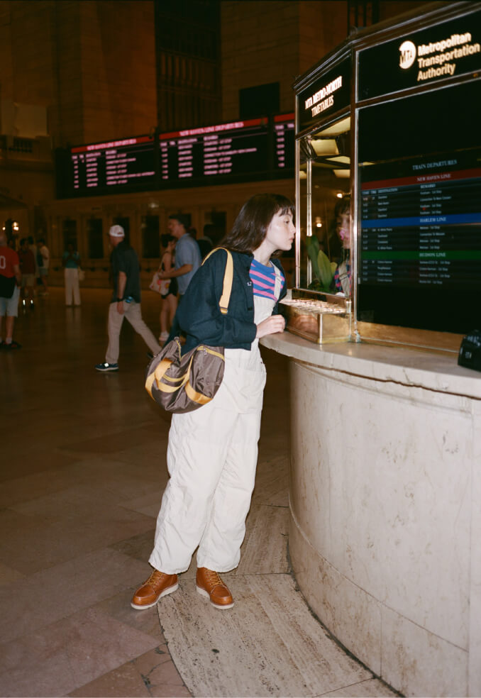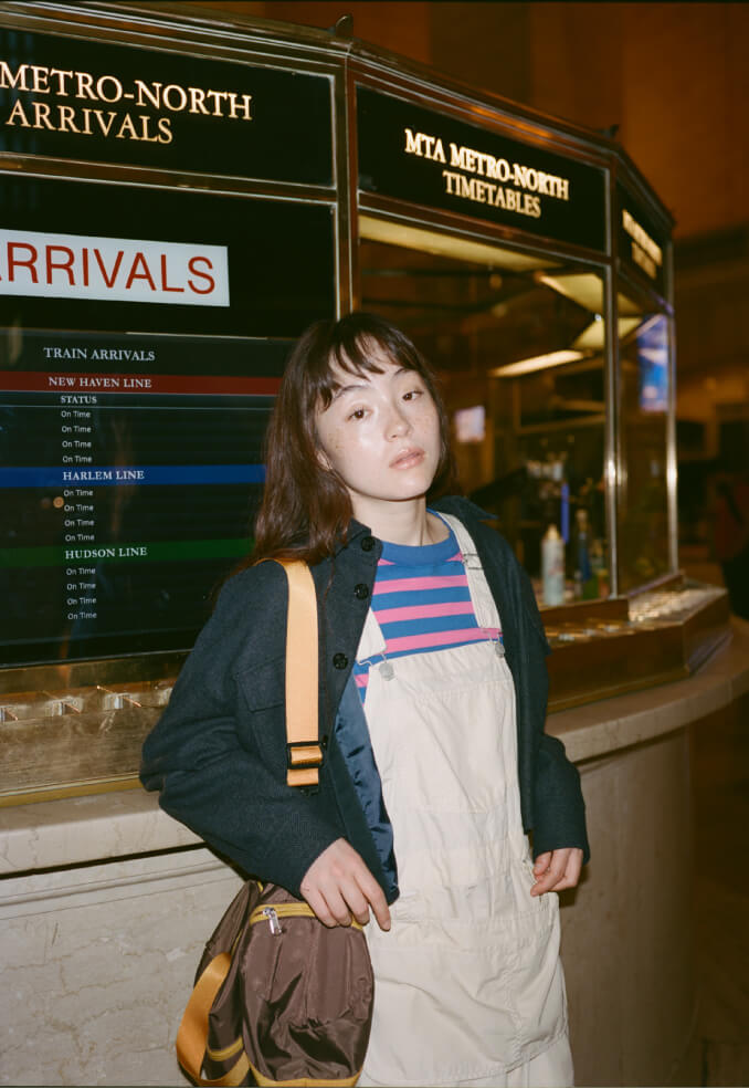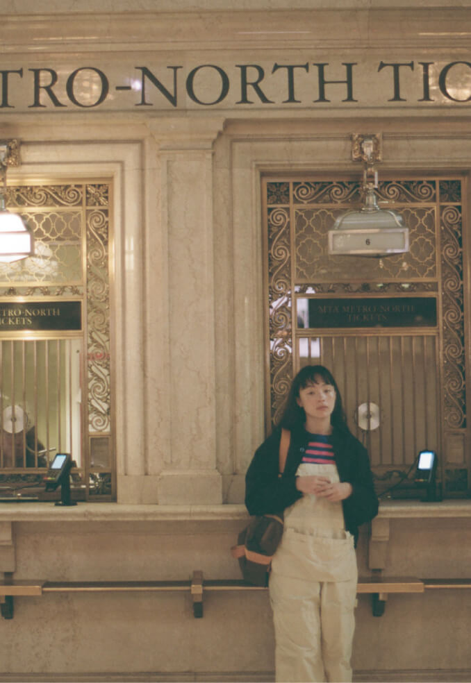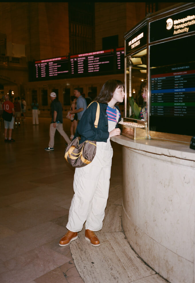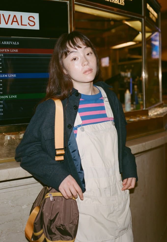 荘厳な雰囲気に引き寄せられてグランドセントラル駅構内へ。オーバーオールにポップなカラーのボーダーTシャツだけだと少し子供っぽくなってしまうけれど、CPOシャツを羽織れば様になるでしょう? 次はこの格好のまま旅に出てみたいな、なんて想像も膨らみます。