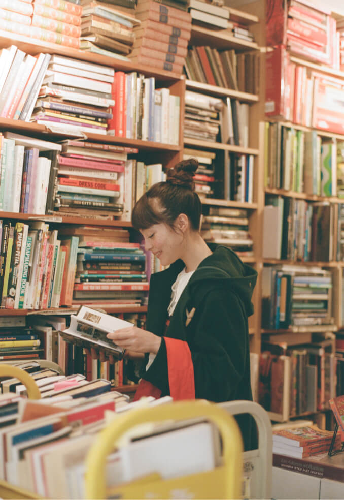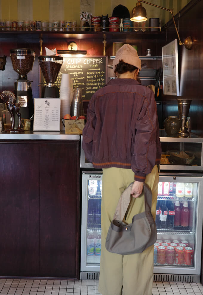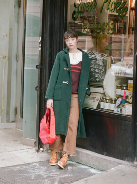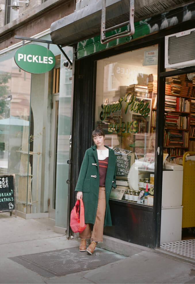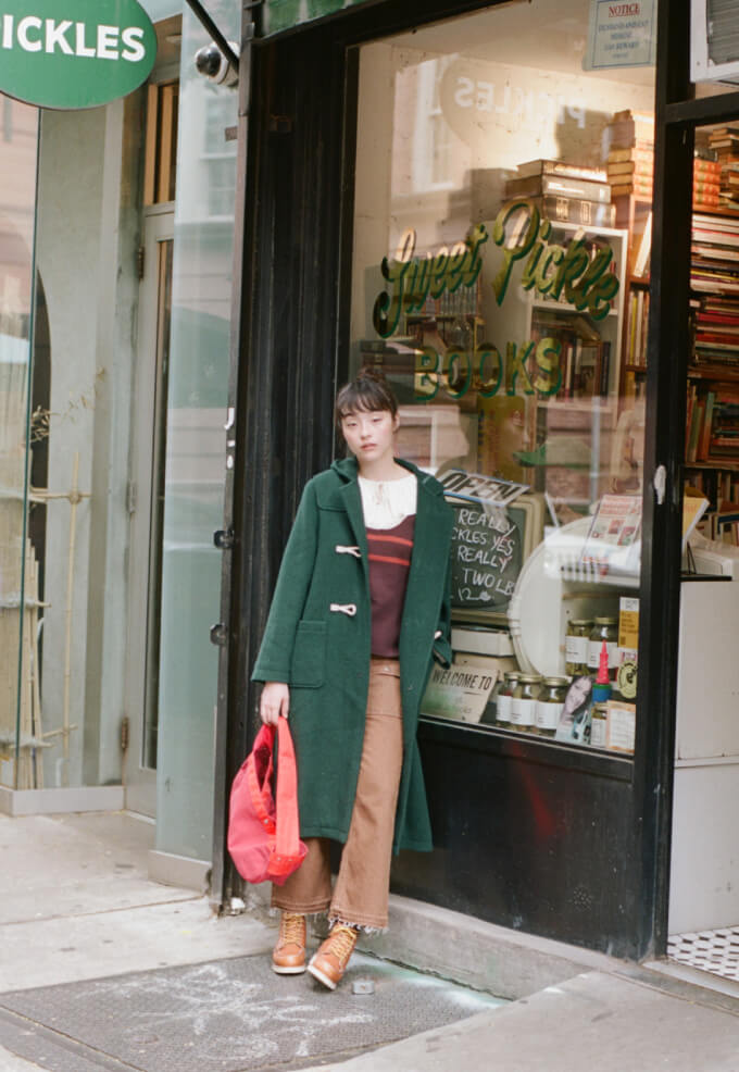 『クレイマー、クレイマー』を観てから、ニューヨークでダッフルコートを着るのが夢だった私たち。ついにその念願を叶えました。そして、ビートニクも愛したコートですから、本屋やバーとの相性も抜群でしょう! と憶測。買った本はニュースペーパーバッグで持ち運びます。