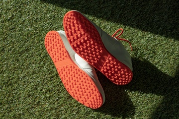 ビビットなプレッピーレッドが印象的なソール部分はスパイクレスを採用し、街でも履くことができる。グリップ力も強く、様々なショットをサポートしてくれる。