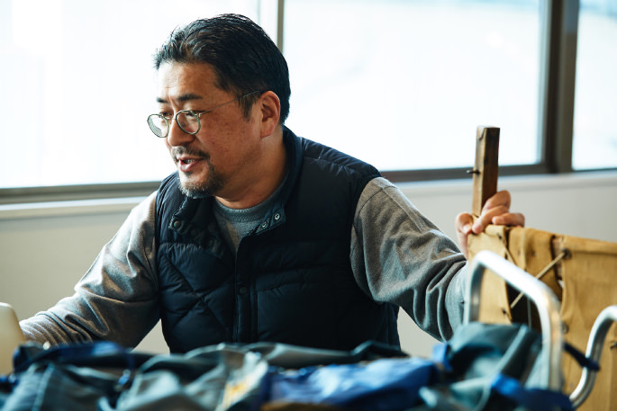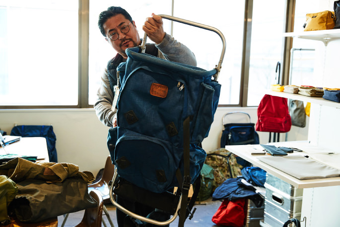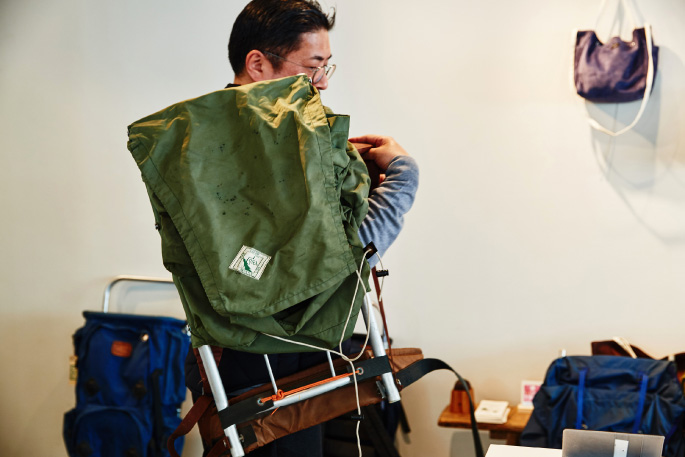 “When I was employed by a company in the 1990s, the Japanese fashion and creative industries enthusiastically followed French aesthetics. Shortly after agnes b. and SAINT JAMES gained great popularity across Japan, Herve Chapeller became in high favor, too. Because I often traveled to European countries for business around that time, my friends used to ask me to bring back the brand’s products for them. The bags from the brand were, however, not so popular in those countries that retailers often hung them at the eaves, though the brand later opened a flagship store in Paris. I remember that the enthusiasm gap between Japan and Euro countries gave me a big surprise. Despite such a trend, American-made simple backpacks of OUTDOOR PRODUCTS remained as one of my favorites and later inspired me to create STANDARD SUPPLY. For some period of time since the establishment of ARTS&CRAFTS, I stuck to making bags by using machines, techniques and sewing methods for clothes making with help from an apparel manufacturer in Okayama. When a textile company in Kojima, Okayama, showed me 60/40 cloth, I came up with an idea to make a simple backpack with the material. I thought the fabric that is thicker and more flexible than nylon might match our brand image as it contains natural fiber. However, because the popularity of vegetable dyed distressed canvas fabric showed no sign of abating at that time, I newly launched STANDARD SUPPLY in 2014 to introduce the simple backpack as the iconic item of the brand.”