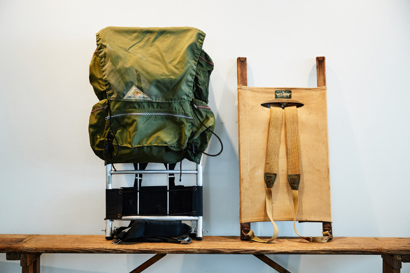 “As far as I know, the history of backpacks in America began from this pack board made by TRAPPER NELSON’S. They perhaps improved Native American’s tool into a handier product as the tag says ‘INDIAN PACK BORAD’. I think the item was originally made to carry hunting game. I think the product with a wooden frame featuring a canvas bag became the origin of a backpack. You can see traces of wire-like pins on the lower part of the product.”