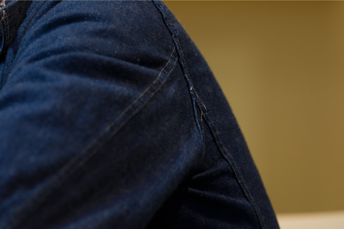 「第二次世界大戦に入ると、物資統制によりディテールが大幅に簡素化されました。このあたりは、他のデニムメーカーと同じ流れですね。ボタンがシンプルになり、ポケットが2つになったり、ステッチの数が減り、工程が少なくなるなどシンプルで癖がなく、力の抜けた感じが個人的にも好きです。一方でショールカラーに代表されるUS NAVYのカバーオールは、ワークウェアの流れではなく、海軍なだけに前から見たセーラーカラーを意識したデザインではないでしょうか。