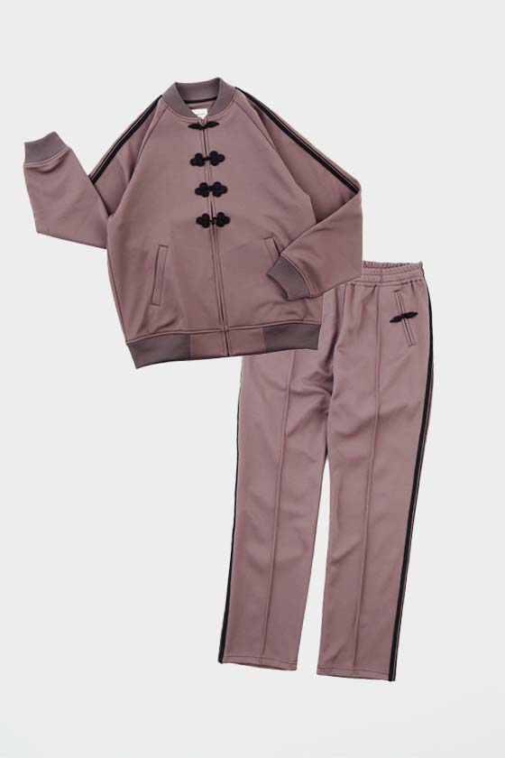2000年代初期に人気を博したレーベル、<B.E.(ビー.イー.)>のジャージを現代的にアレンジして復刻しました。肉厚でしなやかな生地なので、普通のジャージでは体感できない、上質な着心地を約束します。ジップを開けてチャイナボタンを閉じると、Aラインシルエットが綺麗に出せるのもポイント。ボタンは一から作ったこだわりのディテールなんです。パンツはテーパードにアレンジされているので、スポーツで着たら絶対に「なんだそれ!」ってなりますよ。