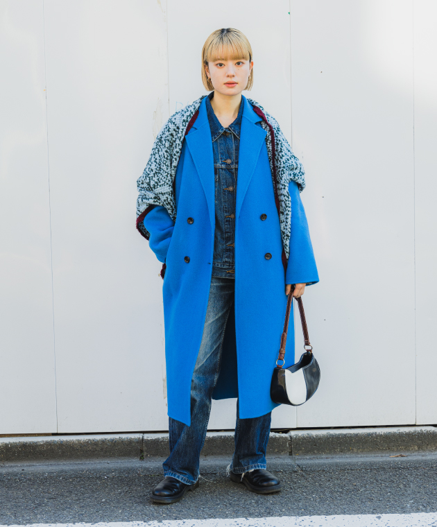 古着っぽいデニム素材のアイテムを合わせることでワンランク上の着こなしに。コートはデニムジャケットの上からでもストレスなく羽織れる、ゆったりとしたシルエットがポイントです。首元にスカーフを巻けば、大人のカジュアルスタイルが完成!
