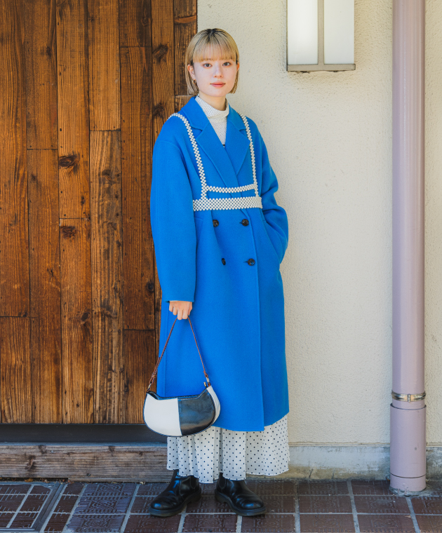 鮮やかなブルーのコートは、適度に甘さを抑えてくれるので、レディライクなワンピースとも好相性。アクセントになるボディベストをあえてコートの上から重ねることで、シルエットが引き締まり、細見え効果も期待できます。