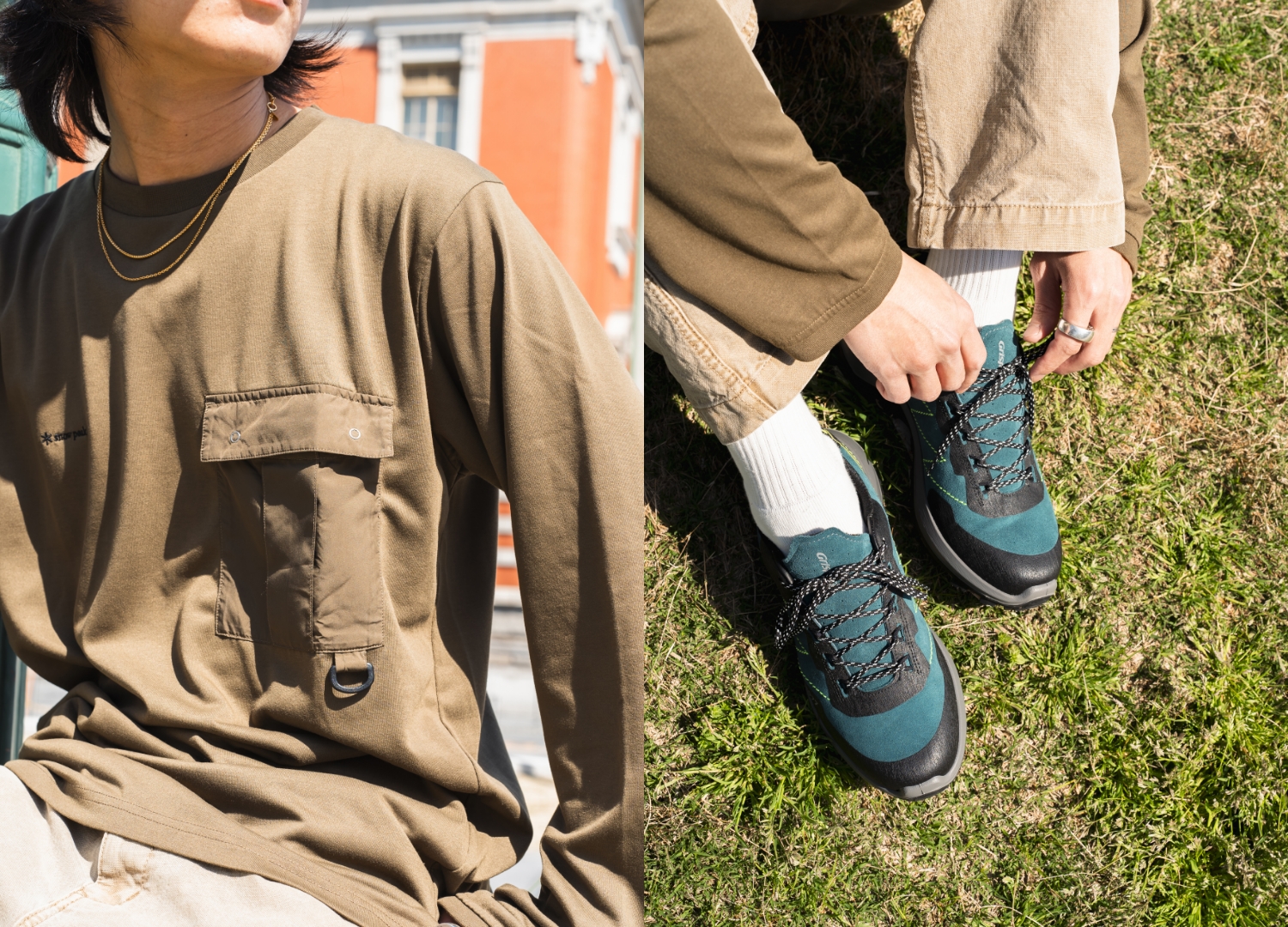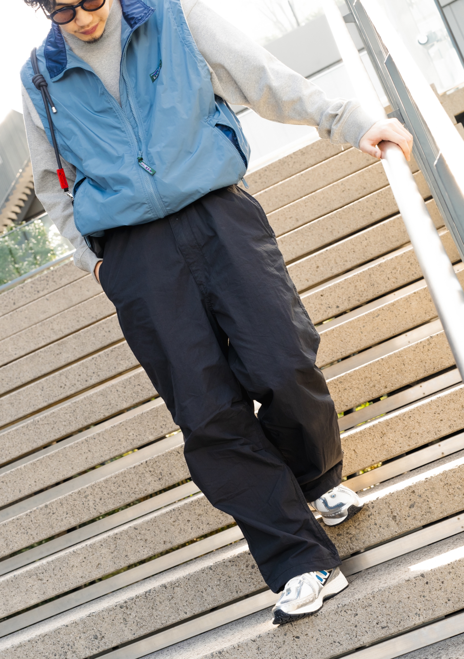 ストライプのTシャツに、薄くて軽いナイロンベストをレイヤード。機能的なアイテムを適度に取り入れ、街とアウトドアの垣根を超えて楽しめるスタイリングに。全体のトーンを抑えることで少し大人な雰囲気に仕上げました。