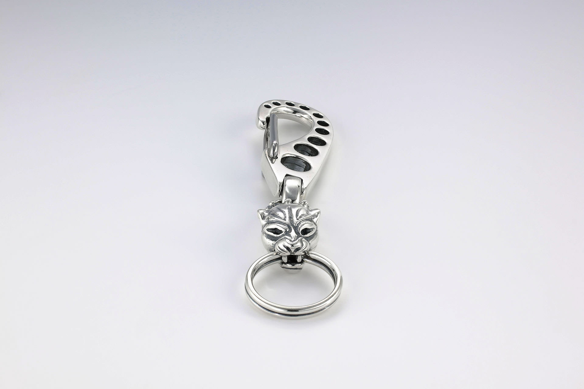 人気のショートキークリップです。先端には、アニマルヘッドの他、特製のヴィンテージスカルをご用意しました。高さを変えて接続したパーツが捻じれる反発を利用して、クリップ部分が留まる様に作られています。船舶用の特殊ステンレスを使用し、高い頻度にも耐久性のある作りです。