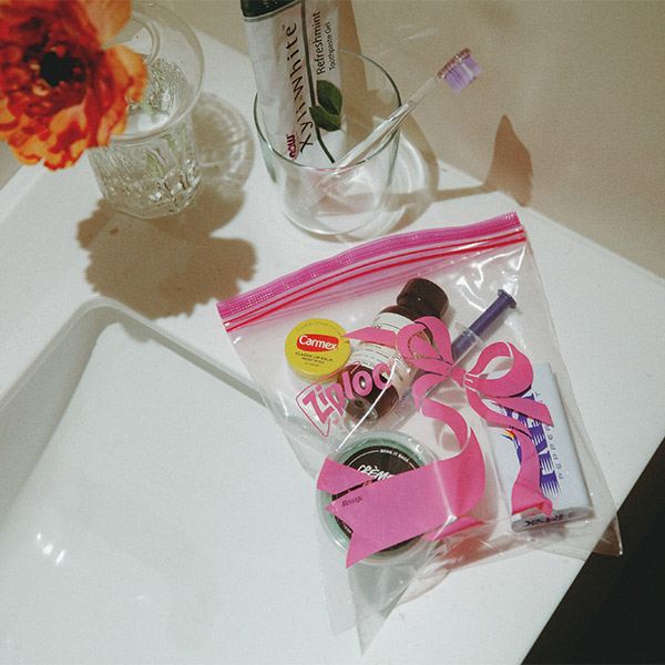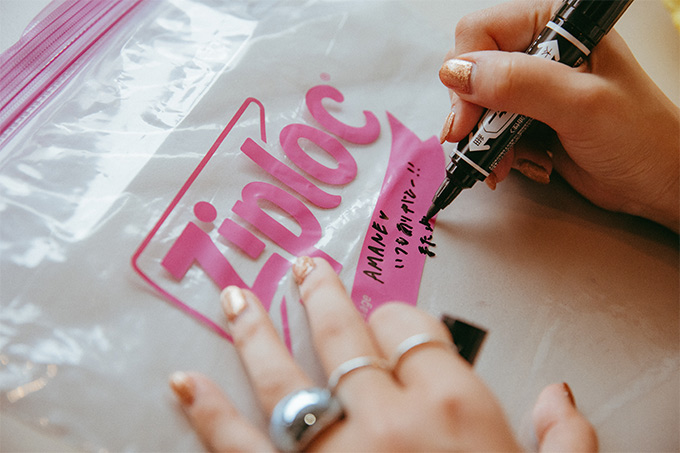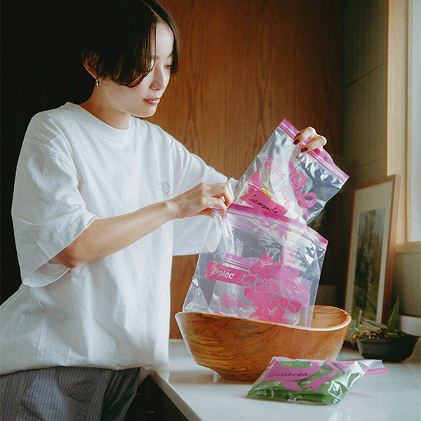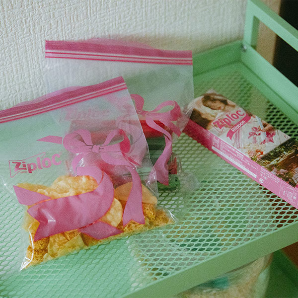 食材を保存するだけでなく、気が付けば家の中も、かばんの中も、ピンクだらけ。私はなによりも美容と健康、そして食事が大好き。モノも多いタイプ。だからこそ〈Ziploc® Ribbon〉が手放せないんです。家では台所はもちろん、寝室でも、洗面所でも使っているし、かばんにはスキンケア用品やサプリメントなんかを入れて持ち歩いています。透明だから中身が一目でわかるし、なにより、ピンクという色が毎日の暮らしに彩りを添えてくれるんです!