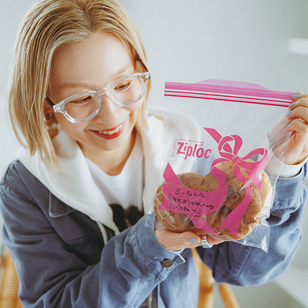 ママ友と仲が良いので、よくお土産をシェアしたり、実家から送られてきた食材をお裾分けしたりすることがあるんです。そんなときは〈Ziploc® Ribbon〉に入れてメッセージを添えれば、清潔感もあって、かわいい仕上がりに♡。