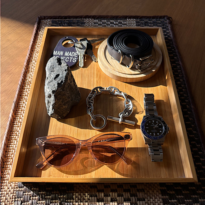 時計や財布、キーリングなど、自分らしい日用品と一緒に置いた時に映えるのがこのベルト。