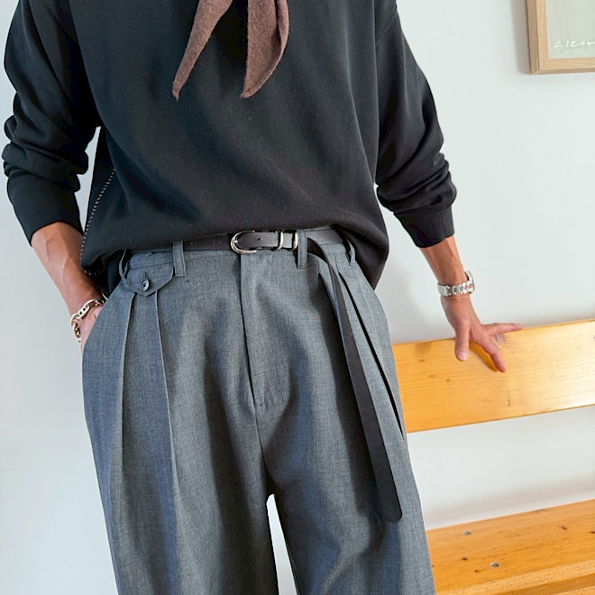 デニムからウールパンツまで、様々なボトムに馴染む懐の深さもこのベルトの魅力です。