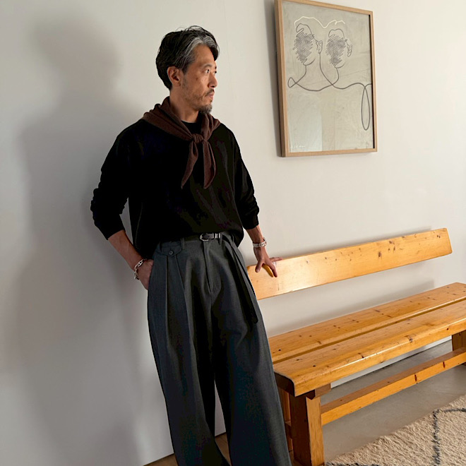 ワイドスラックスとの相性も良く、さりげなくも洒落た印象に。