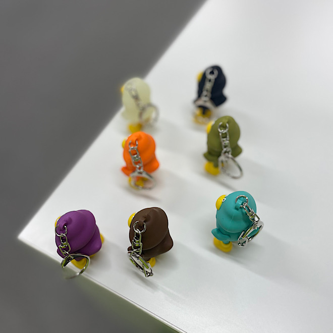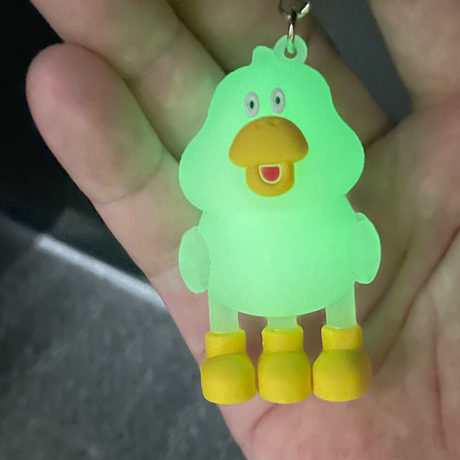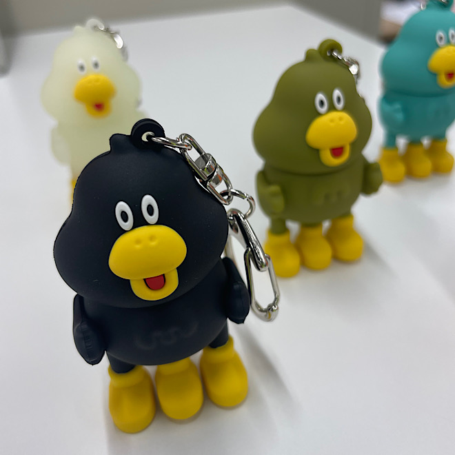 フィギュアの様な重厚感ある作りのキーホルダー。集めたくなるカラフルなダックローと暗いところで光る蓄光タイプの7タイプ。