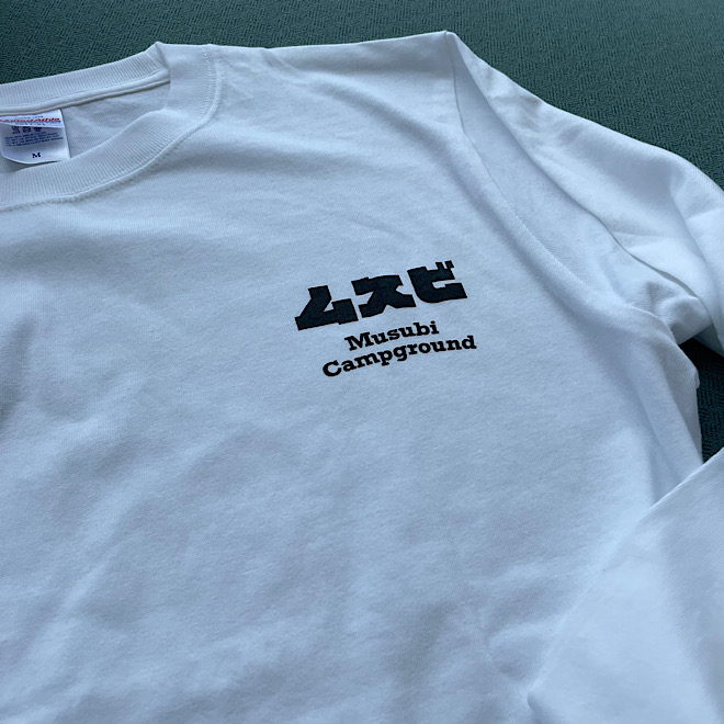 キャンプ好きの人々をつなぐカフェ&ショップの〈TARP to TARP(タープトゥタープ)〉との取り組みである「ムスビ」。バックプリントは「ムスビ」と「TARP to TARP」ロゴの中で、キャンプを楽しんでいる人の様子が描かれている。インパクトがありながらも、シンプルなコーディネイトにも合わせやすいデザイン。