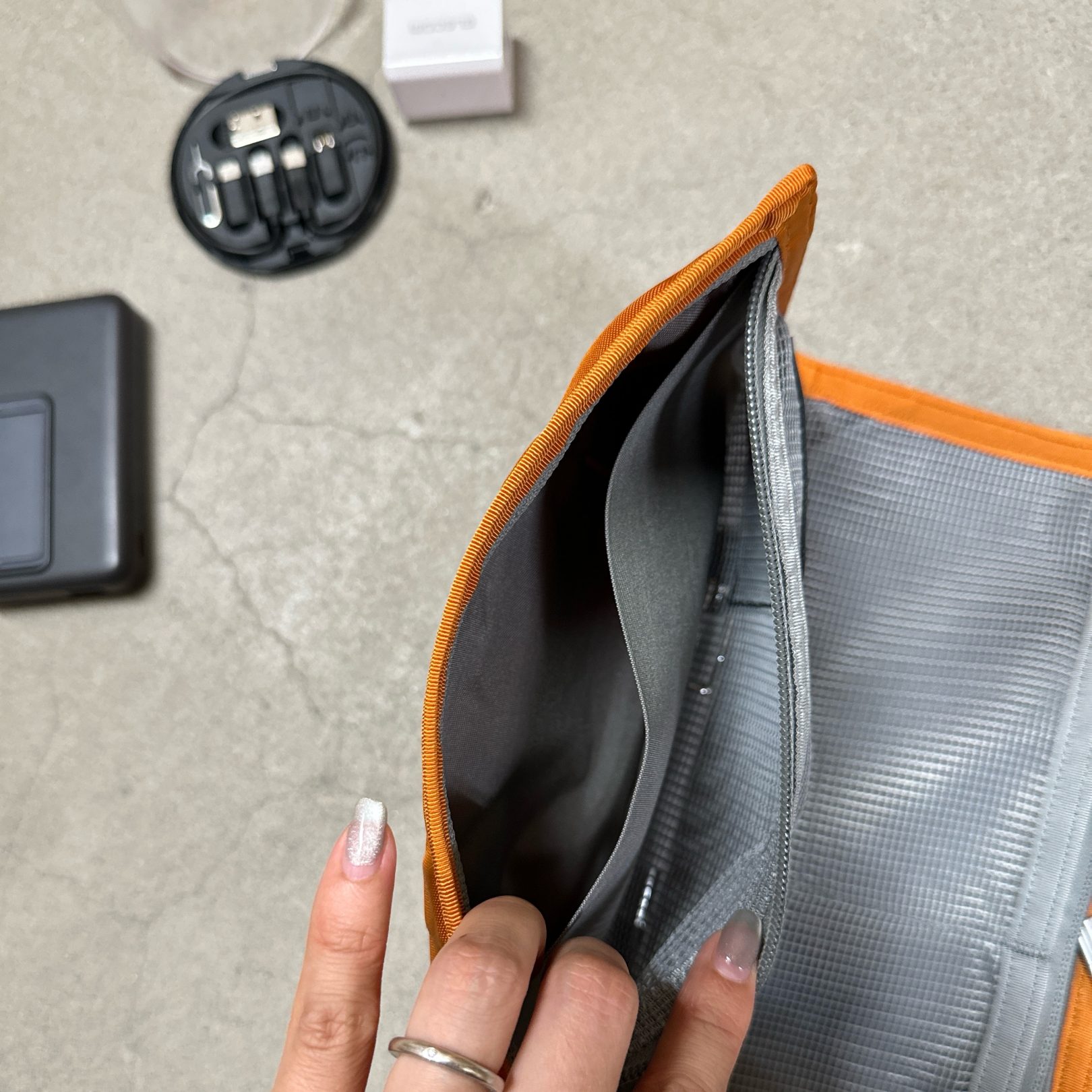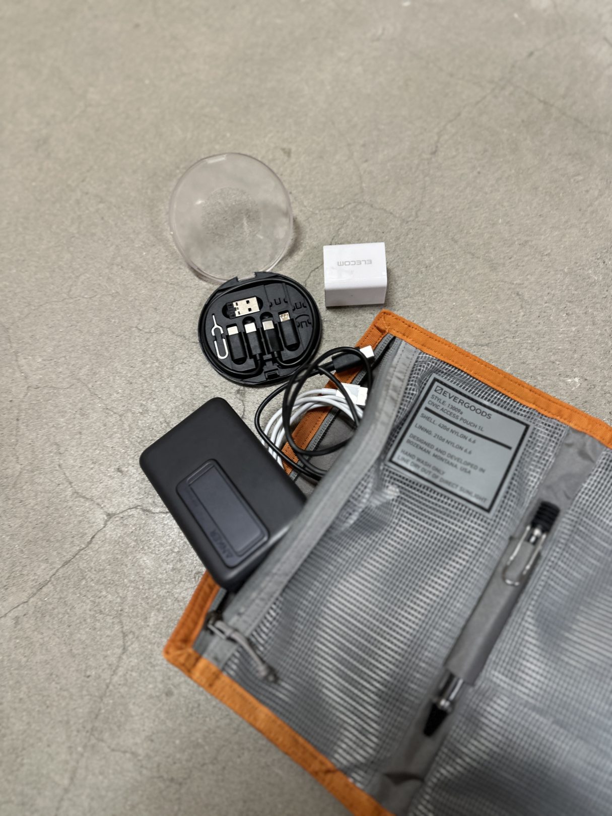 縦にジップを開けると、充電器やコード、いろいろなガジェットが結構しっかり入ります。