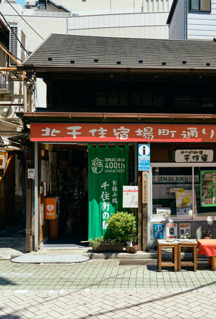 北千住で、最も有名な通りである「宿場町通り商店街」。その一角にあるのが「千住街の駅」。街のプロ達が常駐している観光案内所は、街歩きの前に立ち寄るように。