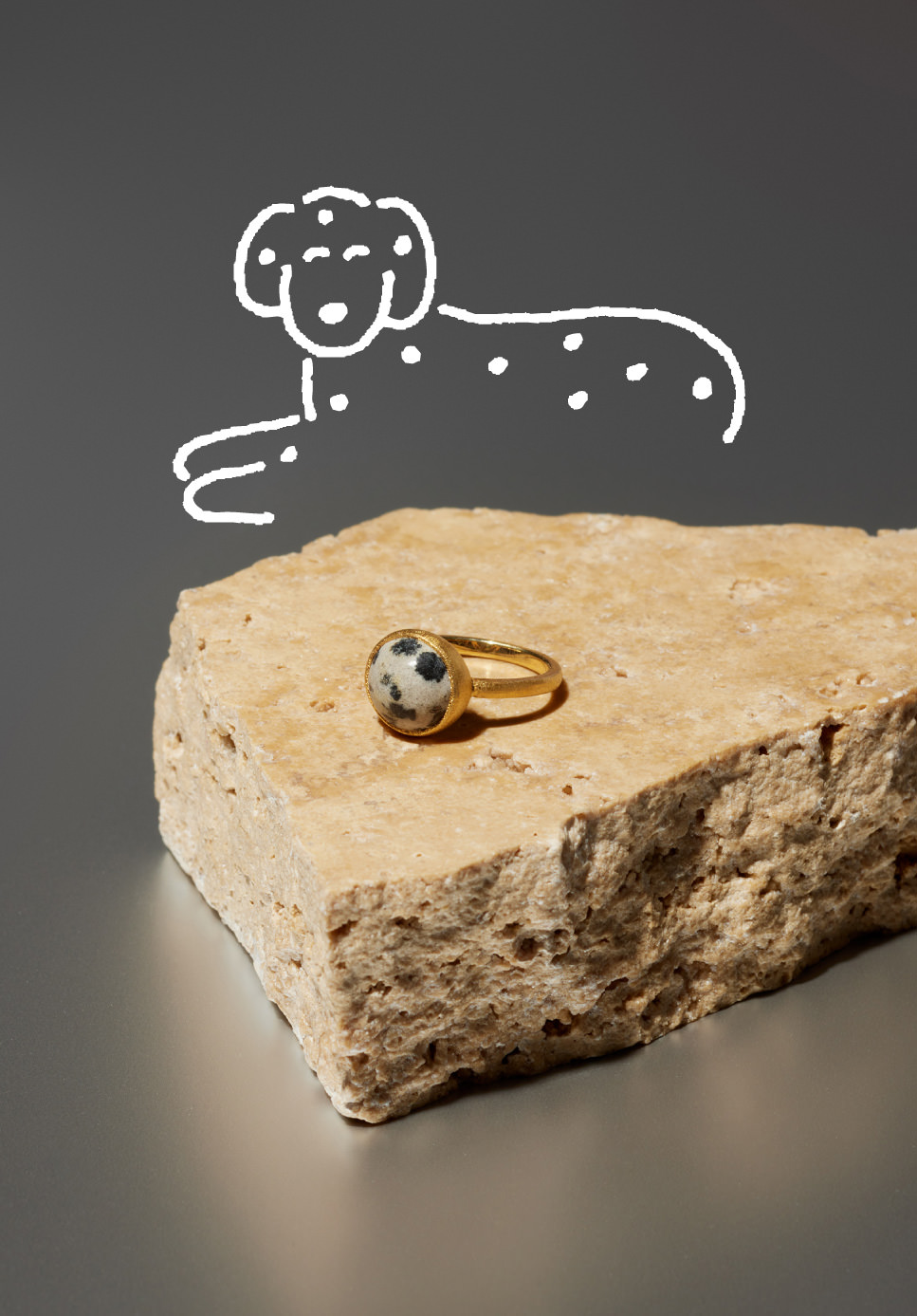 ひとつひとつ表情が違う天然石をつかったリングはときめきを与えてくれるエターナルなアイテム。その中でも白黒の斑点模様がユニークな「ダルメシアンジャスパー」はシンプルベーシック派のコーディネートのアクセントにおすすめです!