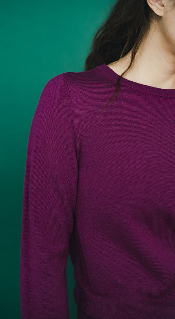ナチュラルな光沢感と滑らかな手触りを両立した、ウール×シルクのブレンド素材を使用したハイゲージニット。縫製を入れない“ホールガーメント製法”を採用することで、縫い代がなく着心地のいいニットに。それと同時にニットが持つ伸縮性が引き出され、女性らしい華奢なサイジングでありながら、快適な着心地を演出。サイドから覗く編み柄の切り替えもポイント。さり気ないアクセントとともに肩の可動域もアップ。