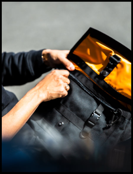 「最近のMA-1人気再燃に影響されて、このカラーリングにしました。MA-1といえばセージグリーンがお馴染みですが、さすがに野暮ったくなりそうだったので、ブラックを選んでます。そしてライニングはもちろんオレンジに。というのも、今回のカスタムオーダーのお話をいただいた時から内側は明るくて視認性の高い色にしようと思ってました。これまで、バッグの中に入れていたモノが見つからなかったことってありませんか?昔、友人の結婚式に参列した時、室内が黒いバッグの中に入れていたご祝儀が見つからなかったことがあったんです。いくら探しても見つからず、結局受付で「すいません、忘れました」ってサイテーな言い訳をして。で、式から家に帰って、おかしいなーと思ってバッグ内をまさぐったら、フラップ状になっていた内ポケットの裏側に挟まっていて……(笑)。黒い荷室の死角。それが今でもトラウマで、今回は視認性の高いオレンジにしています」