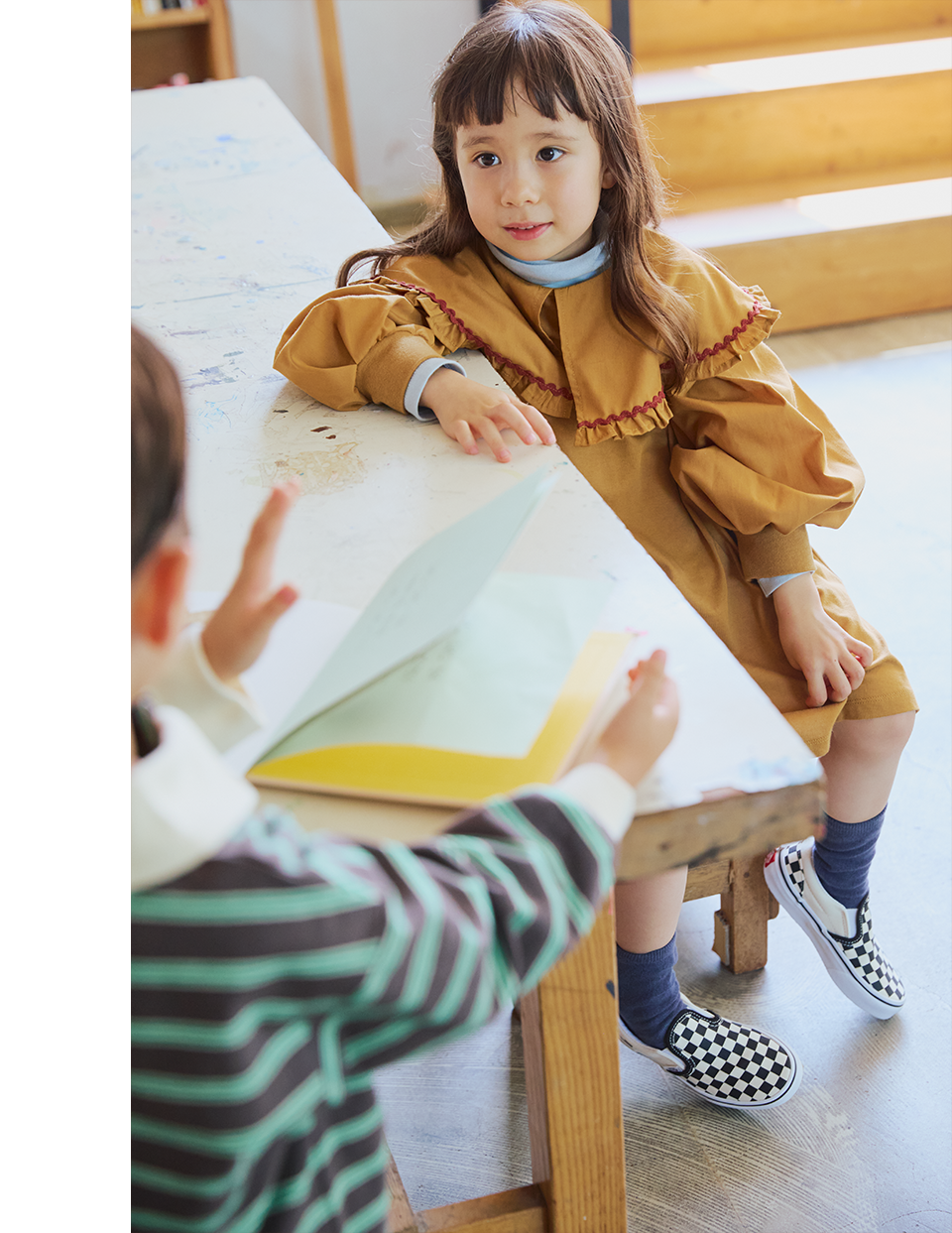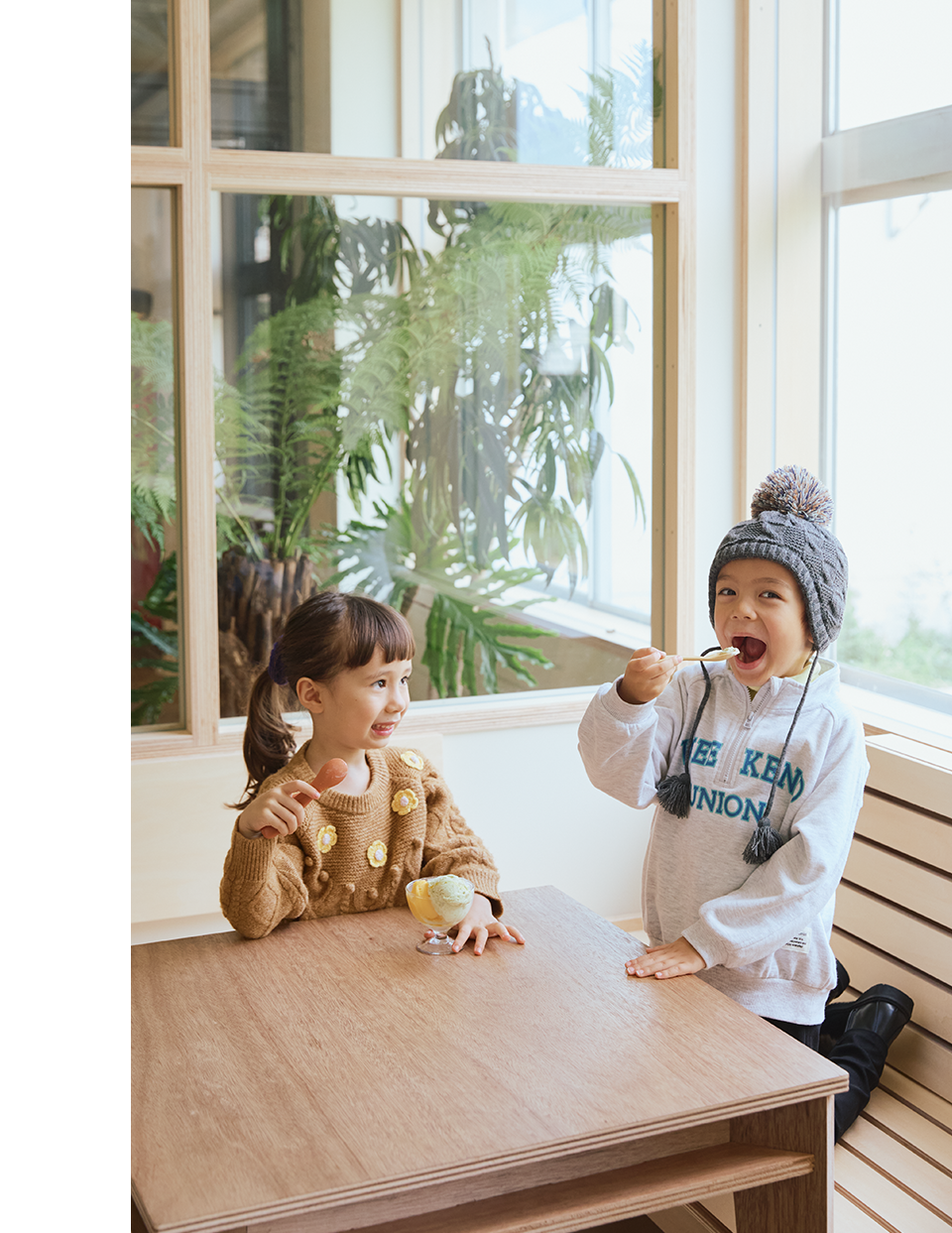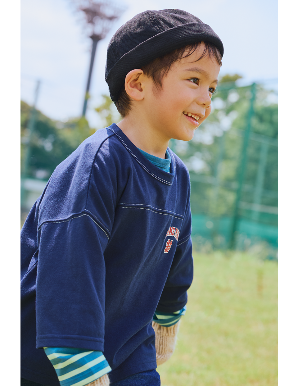 ニットのセットアップ、ハーフジップスウェットなど、大人さながらのアイテムを着こなして、楽しいカフェタイムのはじまり♪ 肩の力を抜いた“ちょっと特別”な装いにするなら、スニーカーでハズしたり、ポンポン付きニット帽でチャーミングに仕上げたり、こどもらしさをプラスする小物使いもポイントに。