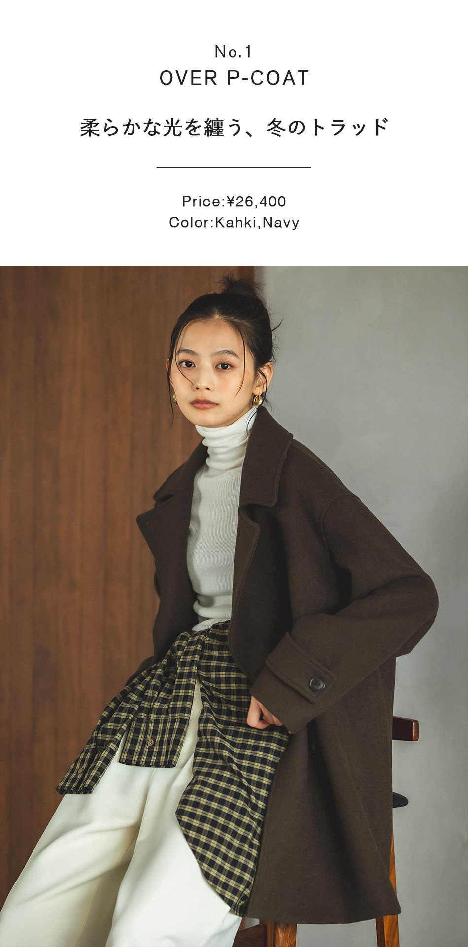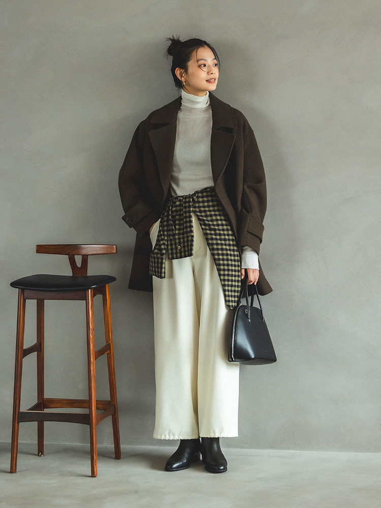 さまざまなシーンにマッチするオーバーPコート。明るいホワイトカラーに、チェックシャツの腰巻きがさりげないアクセントとして◎どんな日も、アウターでそっと気分を整えて。