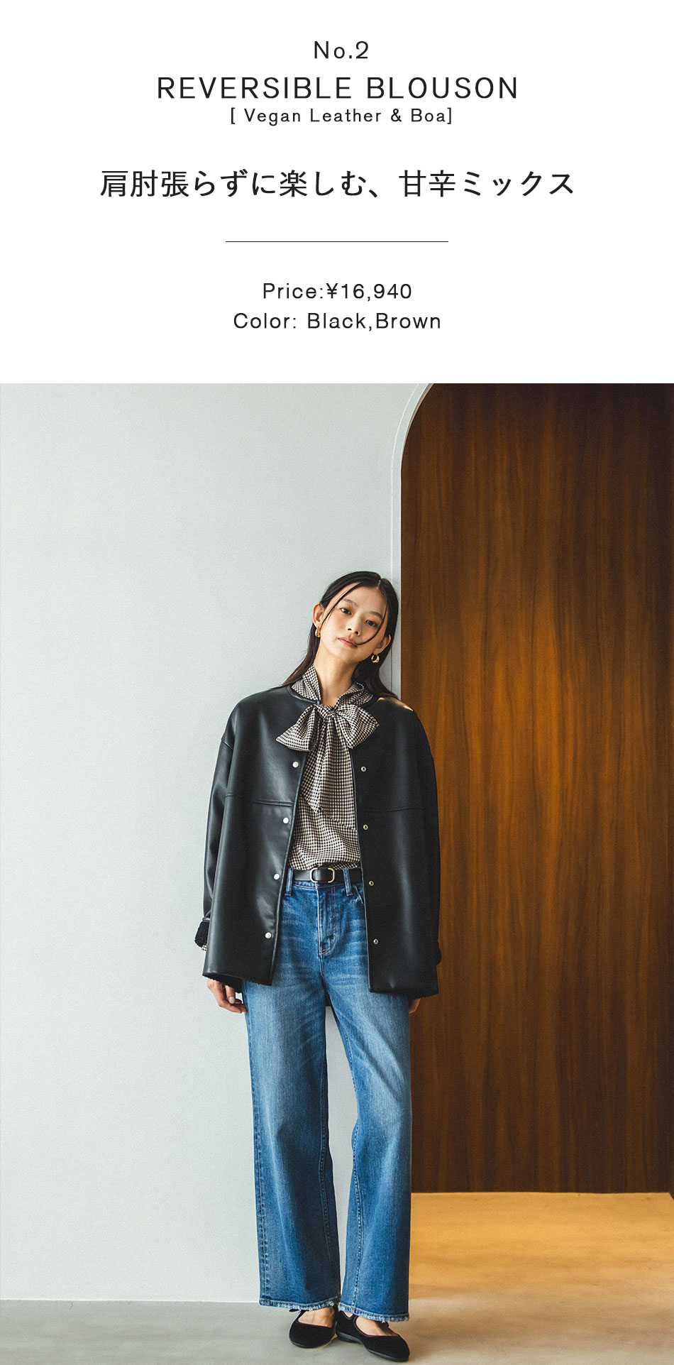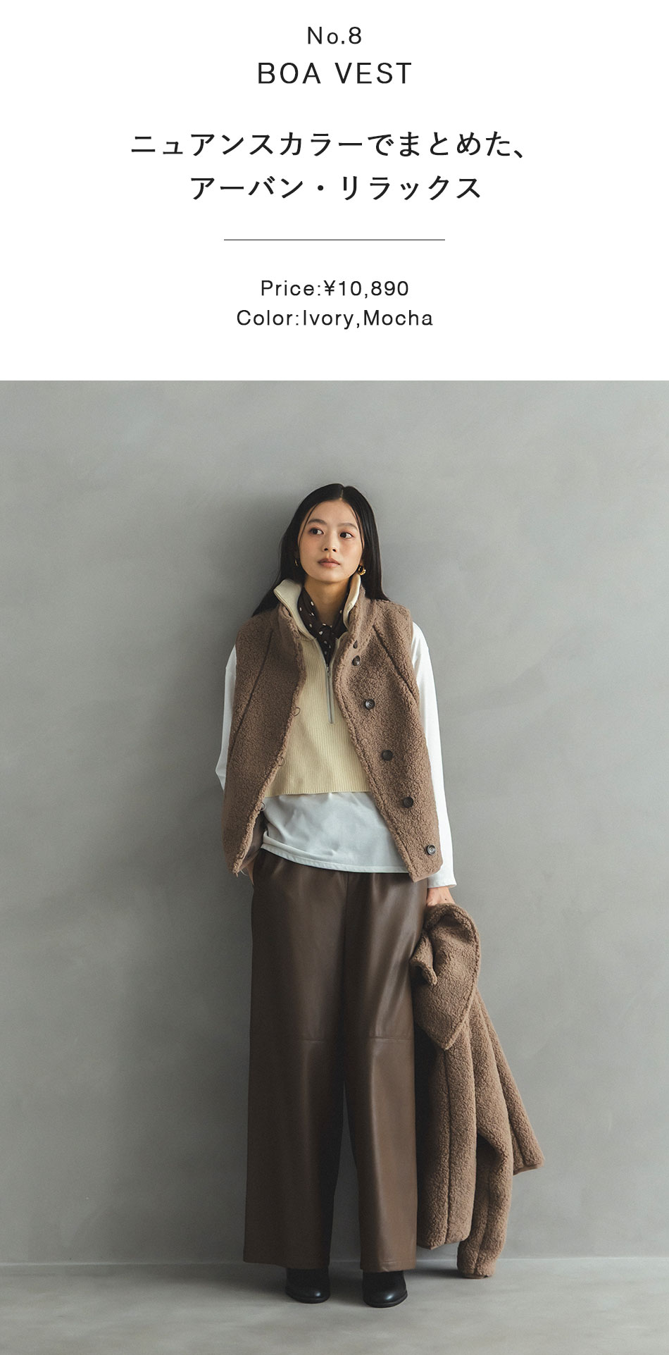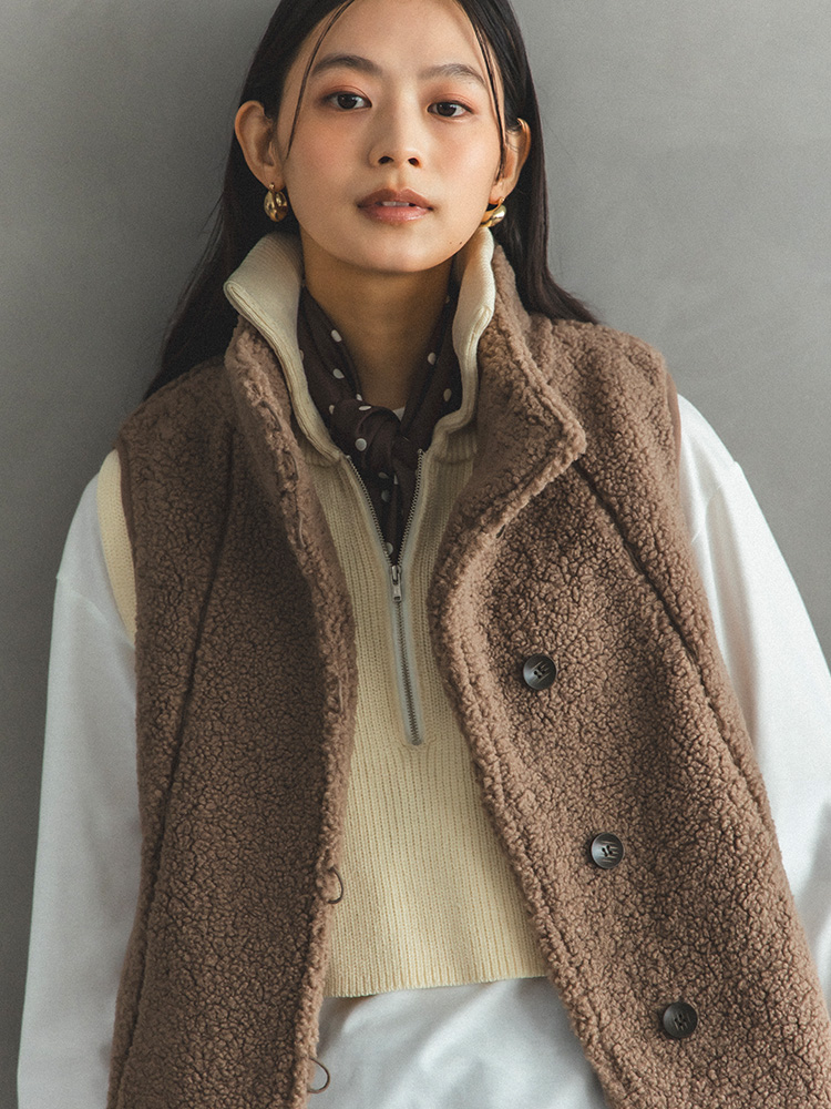 コートの中にも重ねやすく、季節の変わり目には一枚で完結する軽さと暖かさを両立した万能ベスト。ボアやニットの柔らかさとレザーの艶が、“なんでもない日”を少し特別にしてくれる。