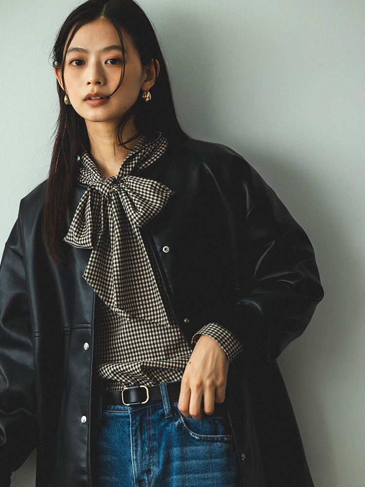 ハンサムな印象のフェイクレザーブルゾンとボウタイブラウスでつくる、トレンド感のあるコーディネート。リラクシーなワイドデニムをあわせて、自然体なのにどこか特別感を漂わせる。